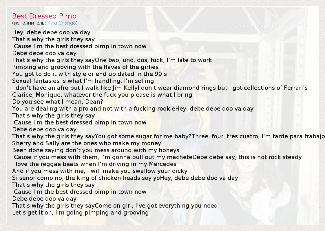 Hey, debe debe doo va day That's why the girls they say 'Cause I'm the best dressed pimp in town now Debe debe doo va day That's why the girls they sayOne two, uno, dos, fuck, I'm late to work Pimping and grooving with the flavas of the girlies You got to do it with style or end up dated in the 90's Sexual fantasies is what I'm handling, I'm selling I don't have an afro but I walk like Jim KellyI don't wear diamond rings but I got collections of Ferrari's Clarice, Monique, whatever the fuck you please is what I bring Do you see what I mean, Dean? You are dealing with a pro and not with a fucking rookieHey, debe debe doo va day That's why the girls they say 'Cause I'm the best dressed pimp in town now Debe debe doo va day That's why the girls they sayYou got some sugar for me baby?Three, four, tres cuatro, I'm tarde para trabajo Sherry and Sally are the ones who make my money Been done saying don't you mess around with my honeys 'Cause if you mess with them, I'm gonna pull out my macheteDebe debe say, this is not rock steady I love the reggae beats when I'm driving in my Mercedes And if you mess with me, I will make you swallow your dicky Si senor como no, the king of chicken heads soy yoHey, debe debe doo va day That's why the girls they say 'Cause I'm the best dressed pimp in town now Debe debe doo va day That's why the girls they sayCome on girl, I've got everything you need Let's get it on, I'm going pimping and grooving
