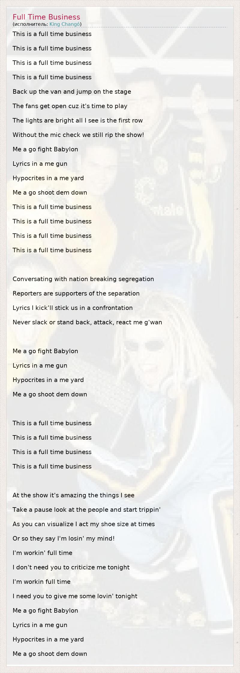This is a full time business This is a full time business This is a full time business This is a full time business Back up the van and jump on the stage The fans get open cuz it's time to play The lights are bright all I see is the first row Without the mic check we still rip the show! Me a go fight Babylon Lyrics in a me gun Hypocrites in a me yard Me a go shoot dem down This is a full time business This is a full time business This is a full time business This is a full time business Conversating with nation breaking segregation Reporters are supporters of the separation Lyrics I kick'll stick us in a confrontation Never slack or stand back, attack, react me g'wan Me a go fight Babylon Lyrics in a me gun Hypocrites in a me yard Me a go shoot dem down This is a full time business This is a full time business This is a full time business This is a full time business At the show it's amazing the things I see Take a pause look at the people and start trippin' As you can visualize I act my shoe size at times Or so they say I'm losin' my mind! I'm workin' full time I don't need you to criticize me tonight I'm workin full time I need you to give me some lovin' tonight Me a go fight Babylon Lyrics in a me gun Hypocrites in a me yard Me a go shoot dem down