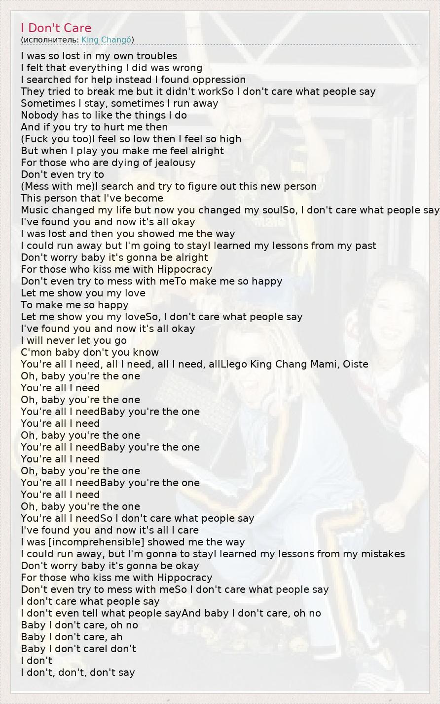 I was so lost in my own troubles I felt that everything I did was wrong I searched for help instead I found oppression They tried to break me but it didn't workSo I don't care what people say Sometimes I stay, sometimes I run away Nobody has to like the things I do And if you try to hurt me then (Fuck you too)I feel so low then I feel so high But when I play you make me feel alright For those who are dying of jealousy Don't even try to (Mess with me)I search and try to figure out this new person This person that I've become Music changed my life but now you changed my soulSo, I don't care what people say I've found you and now it's all okay I was lost and then you showed me the way I could run away but I'm going to stayI learned my lessons from my past Don't worry baby it's gonna be alright For those who kiss me with Hippocracy Don't even try to mess with meTo make me so happy Let me show you my love To make me so happy Let me show you my loveSo, I don't care what people say I've found you and now it's all okay I will never let you go C'mon baby don't you know You're all I need, all I need, all I need, allLlego King Chang Mami, Oiste Oh, baby you're the one You're all I need Oh, baby you're the one You're all I needBaby you're the one You're all I need Oh, baby you're the one You're all I needBaby you're the one You're all I need Oh, baby you're the one You're all I needBaby you're the one You're all I need Oh, baby you're the one You're all I needSo I don't care what people say I've found you and now it's all I care I was [incomprehensible] showed me the way I could run away, but I'm gonna to stayI learned my lessons from my mistakes Don't worry baby it's gonna be okay For those who kiss me with Hippocracy Don't even try to mess with meSo I don't care what people say I don't care what people say I don't even tell what people sayAnd baby I don't care, oh no Baby I don't care, oh no Baby I don't care, ah Baby I don't careI don't I don't I don't, don't, don't say