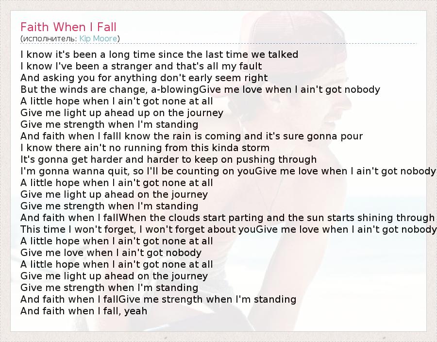 I know it's been a long time since the last time we talked I know I've been a stranger and that's all my fault And asking you for anything don't early seem right But the winds are change, a-blowingGive me love when I ain't got nobody A little hope when I ain't got none at all Give me light up ahead up on the journey Give me strength when I'm standing And faith when I fallI know the rain is coming and it's sure gonna pour I know there ain't no running from this kinda storm It's gonna get harder and harder to keep on pushing through I'm gonna wanna quit, so I'll be counting on youGive me love when I ain't got nobody A little hope when I ain't got none at all Give me light up ahead on the journey Give me strength when I'm standing And faith when I fallWhen the clouds start parting and the sun starts shining through This time I won't forget, I won't forget about youGive me love when I ain't got nobody A little hope when I ain't got none at all Give me love when I ain't got nobody A little hope when I ain't got none at all Give me light up ahead on the journey Give me strength when I'm standing And faith when I fallGive me strength when I'm standing And faith when I fall, yeah