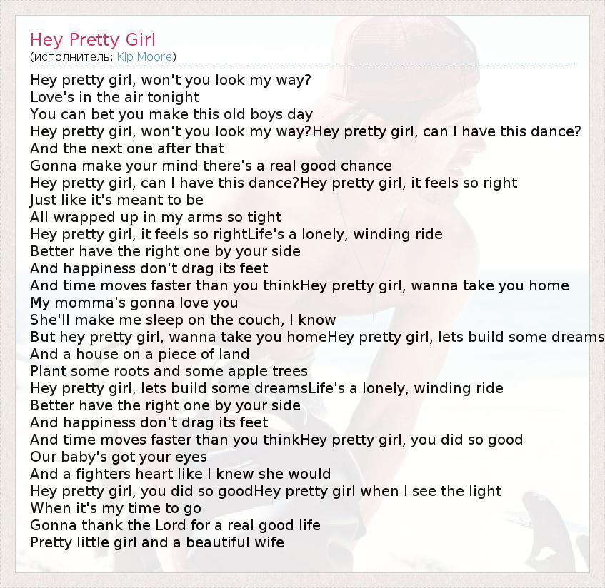 Hey pretty girl, won't you look my way? Love's in the air tonight You can bet you make this old boys day Hey pretty girl, won't you look my way?Hey pretty girl, can I have this dance? And the next one after that Gonna make your mind there's a real good chance Hey pretty girl, can I have this dance?Hey pretty girl, it feels so right Just like it's meant to be All wrapped up in my arms so tight Hey pretty girl, it feels so rightLife's a lonely, winding ride Better have the right one by your side And happiness don't drag its feet And time moves faster than you thinkHey pretty girl, wanna take you home My momma's gonna love you She'll make me sleep on the couch, I know But hey pretty girl, wanna take you homeHey pretty girl, lets build some dreams And a house on a piece of land Plant some roots and some apple trees Hey pretty girl, lets build some dreamsLife's a lonely, winding ride Better have the right one by your side And happiness don't drag its feet And time moves faster than you thinkHey pretty girl, you did so good Our baby's got your eyes And a fighters heart like I knew she would Hey pretty girl, you did so goodHey pretty girl when I see the light When it's my time to go Gonna thank the Lord for a real good life Pretty little girl and a beautiful wife