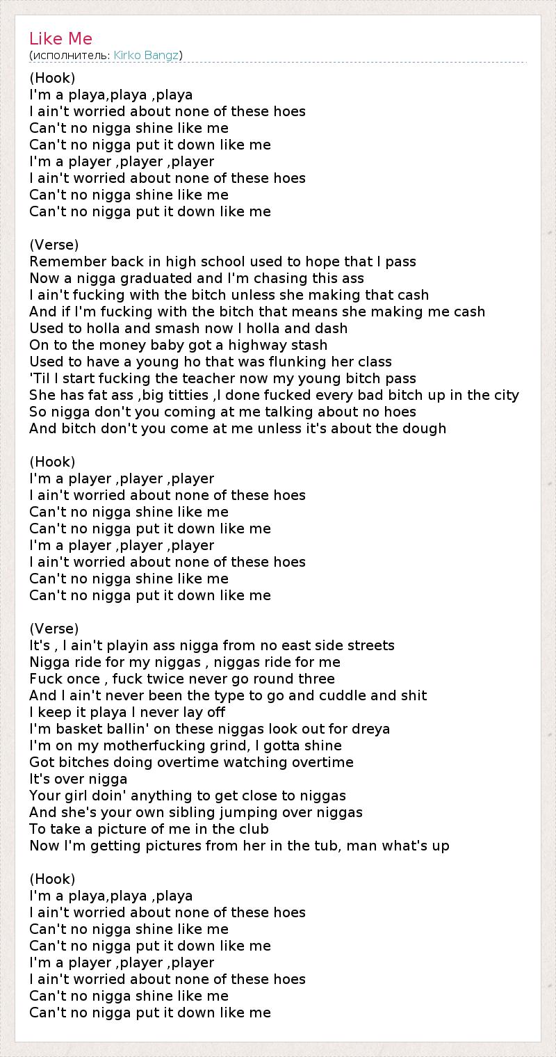 (Hook) I'm a playa,playa ,playa I ain't worried about none of these hoes Can't no nigga shine like me Can't no nigga put it down like me I'm a player ,player ,player I ain't worried about none of these hoes Can't no nigga shine like me Can't no nigga put it down like me (Verse) Remember back in high school used to hope that I pass Now a nigga graduated and I'm chasing this ass I ain't fucking with the bitch unless she making that cash And if I'm fucking with the bitch that means she making me cash Used to holla and smash now I holla and dash On to the money baby got a highway stash Used to have a young ho that was flunking her class 'Til I start fucking the teacher now my young bitch pass She has fat ass ,big titties ,I done fucked every bad bitch up in the city So nigga don't you coming at me talking about no hoes And bitch don't you come at me unless it's about the dough (Hook) I'm a player ,player ,player I ain't worried about none of these hoes Can't no nigga shine like me Can't no nigga put it down like me I'm a player ,player ,player I ain't worried about none of these hoes Can't no nigga shine like me Can't no nigga put it down like me (Verse) It's , I ain't playin ass nigga from no east side streets Nigga ride for my niggas , niggas ride for me Fuck once , fuck twice never go round three And I ain't never been the type to go and cuddle and shit I keep it playa I never lay off I'm basket ballin' on these niggas look out for dreya I'm on my motherfucking grind, I gotta shine Got bitches doing overtime watching overtime It's over nigga Your girl doin' anything to get close to niggas And she's your own sibling jumping over niggas To take a picture of me in the club Now I'm getting pictures from her in the tub, man what's up (Hook) I'm a playa,playa ,playa I ain't worried about none of these hoes Can't no nigga shine like me Can't no nigga put it down like me I'm a player ,player ,player I ain't worried about none of these hoes Can't no nigga shine like me Can't no nigga put it down like me