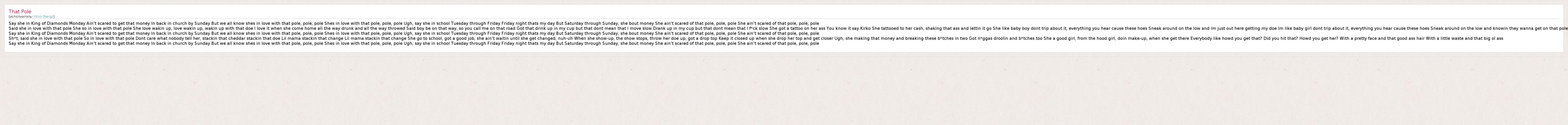 Say she in King of Diamonds Monday Ain't scared to get that money In back in church by Sunday But we all know shes in love with that pole, pole, pole Shes in love with that pole, pole, pole Ugh, say she in school Tuesday through Friday Friday night thats my day But Saturday through Sunday, she bout money She ain't scared of that pole, pole, pole She ain't scared of that pole, pole, pole Said she in love with that pole She so in love with that pole She love wakin up, love wakin up, wakin up with that doe I love it when she come home all the way drunk and all the way throwed Said boy be on that way, so you call me on that road Got that drink up in my cup but that dont mean that I move slow Drank up in my cup but that dont mean that I f*ck slow She got a tattoo on her ass You know it say Kirko She tattooed to her cash, shaking that ass and lettin it go She like baby boy dont trip about it, everything you hear cause these hoes Sneak around on the low and Im just out here getting my doe Im like baby girl dont trip about it, everything you hear cause these hoes Sneak around on the low and knowin they wanna get on that pole Say she in King of Diamonds Monday Ain't scared to get that money In back in church by Sunday But we all know shes in love with that pole, pole, pole Shes in love with that pole, pole, pole Ugh, say she in school Tuesday through Friday Friday night thats my day But Saturday through Sunday, she bout money She ain't scared of that pole, pole, pole She ain't scared of that pole, pole, pole Sh*t, said she in love with that pole So in love with that pole Dont care what nobody tell her, stackin that cheddar stackin that doe Lil mama stackin that change Lil mama stackin that change She go to school, got a good job, she ain't waitin until she get changed, nuh-uh When she show-up, the show stops, throw her doe up, got a drop top Keep it closed up when she drop her top and get closer Ugh, she making that money and breaking these b*tches in two Got n*ggas droolin and b*tches too She a good girl, from the hood girl, doin make-up, when she get there Everybody like howd you get that? Did you hit that? Howd you get her? With a pretty face and that good ass hair With a little waste and that big ol ass Say she in King of Diamonds Monday Ain't scared to get that money In back in church by Sunday But we all know shes in love with that pole, pole, pole Shes in love with that pole, pole, pole Ugh, say she in school Tuesday through Friday Friday night thats my day But Saturday through Sunday, she bout money She ain't scared of that pole, pole, pole She ain't scared of that pole, pole, pole