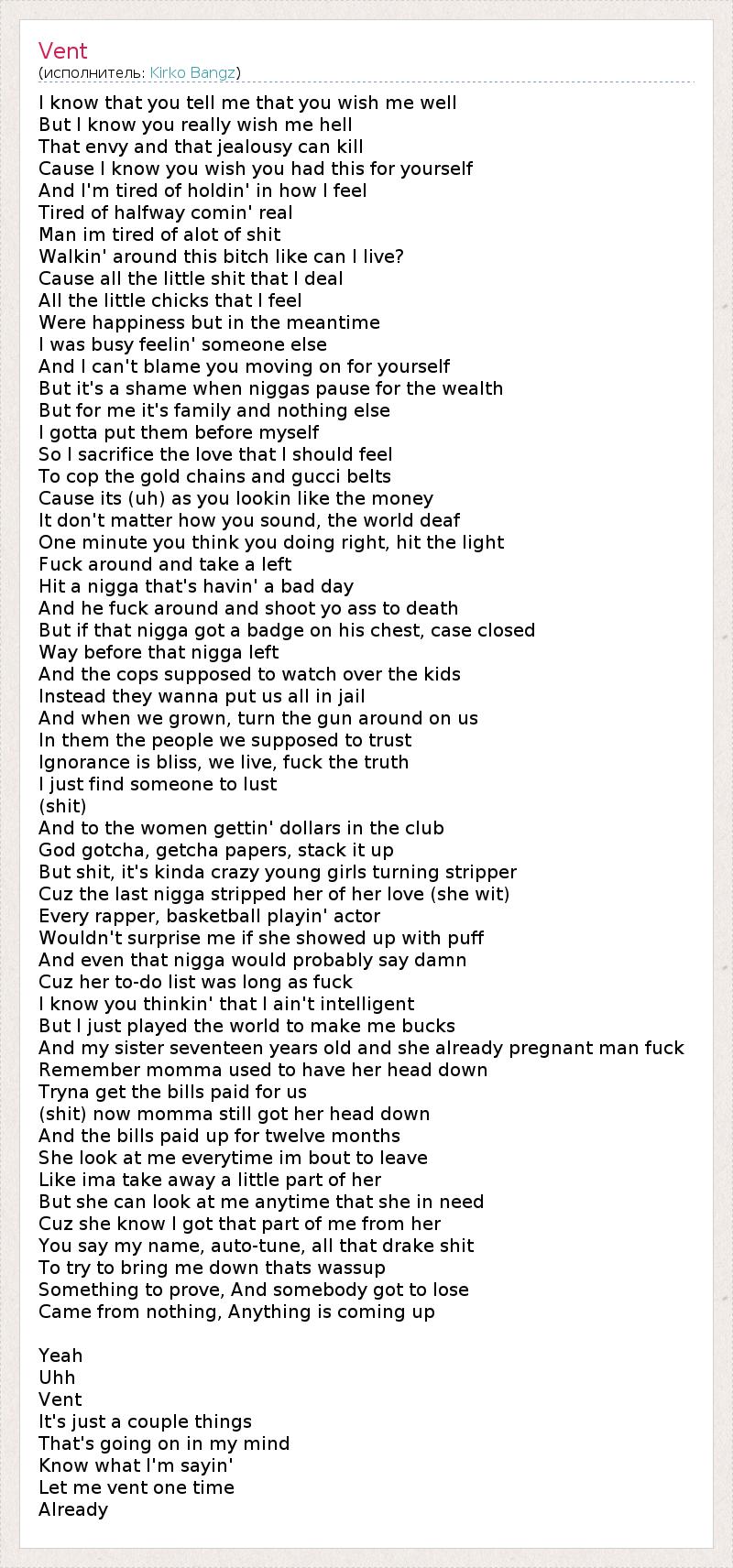 I know that you tell me that you wish me well But I know you really wish me hell That envy and that jealousy can kill Cause I know you wish you had this for yourself And I'm tired of holdin' in how I feel Tired of halfway comin' real Man im tired of alot of shit Walkin' around this bitch like can I live? Cause all the little shit that I deal All the little chicks that I feel Were happiness but in the meantime I was busy feelin' someone else And I can't blame you moving on for yourself But it's a shame when niggas pause for the wealth But for me it's family and nothing else I gotta put them before myself So I sacrifice the love that I should feel To cop the gold chains and gucci belts Cause its (uh) as you lookin like the money It don't matter how you sound, the world deaf One minute you think you doing right, hit the light Fuck around and take a left Hit a nigga that's havin' a bad day And he fuck around and shoot yo ass to death But if that nigga got a badge on his chest, case closed Way before that nigga left And the cops supposed to watch over the kids Instead they wanna put us all in jail And when we grown, turn the gun around on us In them the people we supposed to trust Ignorance is bliss, we live, fuck the truth I just find someone to lust (shit) And to the women gettin' dollars in the club God gotcha, getcha papers, stack it up But shit, it's kinda crazy young girls turning stripper Cuz the last nigga stripped her of her love (she wit) Every rapper, basketball playin' actor Wouldn't surprise me if she showed up with puff And even that nigga would probably say damn Cuz her to-do list was long as fuck I know you thinkin' that I ain't intelligent But I just played the world to make me bucks And my sister seventeen years old and she already pregnant man fuck Remember momma used to have her head down Tryna get the bills paid for us (shit) now momma still got her head down And the bills paid up for twelve months She look at me everytime im bout to leave Like ima take away a little part of her But she can look at me anytime that she in need Cuz she know I got that part of me from her You say my name, auto-tune, all that drake shit To try to bring me down thats wassup Something to prove, And somebody got to lose Came from nothing, Anything is coming up Yeah Uhh Vent It's just a couple things That's going on in my mind Know what I'm sayin' Let me vent one time Already