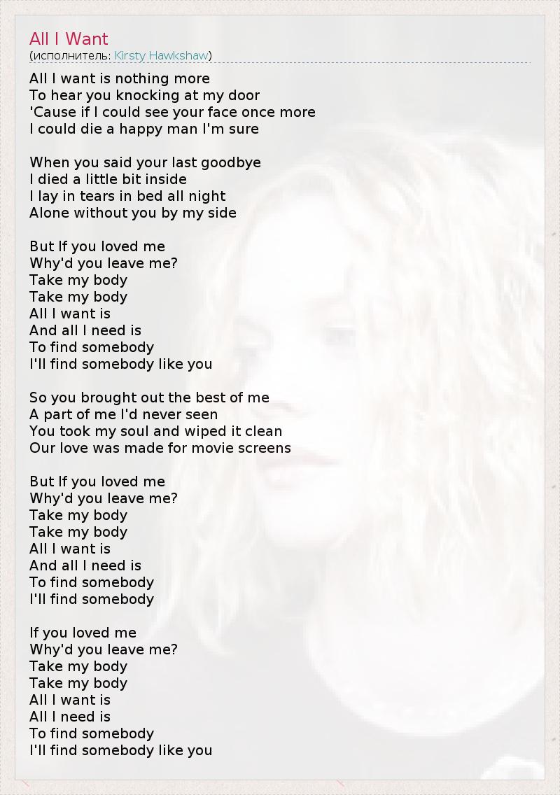 All I want is nothing more To hear you knocking at my door 'Cause if I could see your face once more I could die a happy man I'm sure When you said your last goodbye I died a little bit inside I lay in tears in bed all night Alone without you by my side But If you loved me Why'd you leave me? Take my body Take my body All I want is And all I need is To find somebody I'll find somebody like you So you brought out the best of me A part of me I'd never seen You took my soul and wiped it clean Our love was made for movie screens But If you loved me Why'd you leave me? Take my body Take my body All I want is And all I need is To find somebody I'll find somebody If you loved me Why'd you leave me? Take my body Take my body All I want is All I need is To find somebody I'll find somebody like you