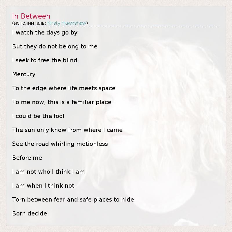 I watch the days go by But they do not belong to me I seek to free the blind Mercury To the edge where life meets space To me now, this is a familiar place I could be the fool The sun only know from where I came See the road whirling motionless Before me I am not who I think I am I am when I think not Torn between fear and safe places to hide Born decide