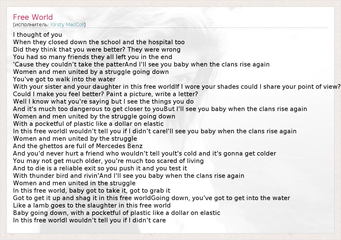 I thought of you When they closed down the school and the hospital too Did they think that you were better? They were wrong You had so many friends they all left you in the end 'Cause they couldn't take the patterAnd I'll see you baby when the clans rise again Women and men united by a struggle going down You've got to walk into the water With your sister and your daughter in this free worldIf I wore your shades could I share your point of view? Could I make you feel better? Paint a picture, write a letter? Well I know what you're saying but I see the things you do And it's much too dangerous to get closer to youBut I'll see you baby when the clans rise again Women and men united by the struggle going down With a pocketful of plastic like a dollar on elastic In this free worldI wouldn't tell you if I didn't careI'll see you baby when the clans rise again Women and men united by the struggle And the ghettos are full of Mercedes Benz And you'd never hurt a friend who wouldn't tell youIt's cold and it's gonna get colder You may not get much older, you're much too scared of living And to die is a reliable exit so you push it and you test it With thunder bird and rivin'And I'll see you baby when the clans rise again Women and men united in the struggle In this free world, baby got to take it, got to grab it Got to get it up and shag it in this free worldGoing down, you've got to get into the water Like a lamb goes to the slaughter in this free world Baby going down, with a pocketful of plastic like a dollar on elastic In this free worldI wouldn't tell you if I didn't care