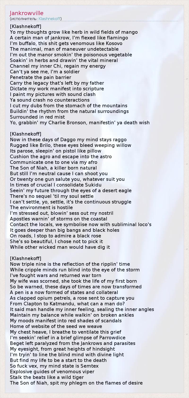 [Klashnekoff] Yo my thoughts grow like herb in wild fields of mango A certain man of jankrow, I'm flexed like flamingo I'm buffalo, this shit gets venomous like Kosovo The manimal, man of maneuver undetectable I'm out the manor smokin' the poisonous vegetable Soakin' in herbs and drawin' the vital mineral Channel my inner Chi, regain my energy Can't ya see me, I'm a soldier Penetrate the pain barrier Carry the legacy that's left by my father Dictate my work manifest into scripture I paint my pictures with sound clash Ya sound crash no counteractions I cut my dubs from the stomach of the mountains Buildin' the rhythm from the natural surroundings Surrounded in red mist Yo, grabbin' my Charlie Bronson, manifestin' ya death wish [Klashnekoff] Now in these days of Daggo my mind stays raggo Rugged like Brilo, these eyes bleed weeping willow Its parose, sleepin' on pistol like pillow Cushion the agro and escape into the astro Communicate one to one via my afro The Son of Niah, a killer born natural But still I'm neutral cause I can shoot you Or twenty one gun salute you, whatever suit you In times of crucial I consolidate Sukidu Seein' my future through the eyes of a desert eagle There's no sequel 'til my soul settle I can't settle, yo, settle, it's the continuous struggle The environment is hostile I'm stressed out, blowin' sess out my nostril Apostles warnin' of storms on the coastal Contact the locals, we symbolise now with subliminal loco's It goes deeper than big bangs and black holes On roads, I stop to admire a black rose She's so beautiful, I chose not to pick it While other wicked man would have dig it [Klashnekoff] Now triple nine is the reflection of the ripplin' time While cripple minds run blind into the eye of the storm I've fought wars and returned war torn My wife was scorned, she took the life of my first born So be warned, these days of times are now transformed A pen is a now formed of states and collateral As clapped opium petrels, a rose sent to capture you From Clapton to Katmandu, what can a man do? It said man handle my inner feeling, sealing the inner angles Maintain my balance while walkin' on broken ankles My moods manifest into red shades of scandals Home of website of the seed we weave My chest heave, I breathe to ventilate this grief I'm seekin' relief in a brief glimpse of Parrowdice Beget left paralyzed from the Jankrows and parasites My eyesight, from great heights of hindsight I'm tryin' to line the blind mind with divine light But find my life to be a start to the death So fuck vex, my mind state is Semtex Explosive guides of venomous viper Stalk the beats like a wild tiger The Son of Niah, spit my phlegm on the flames of desire