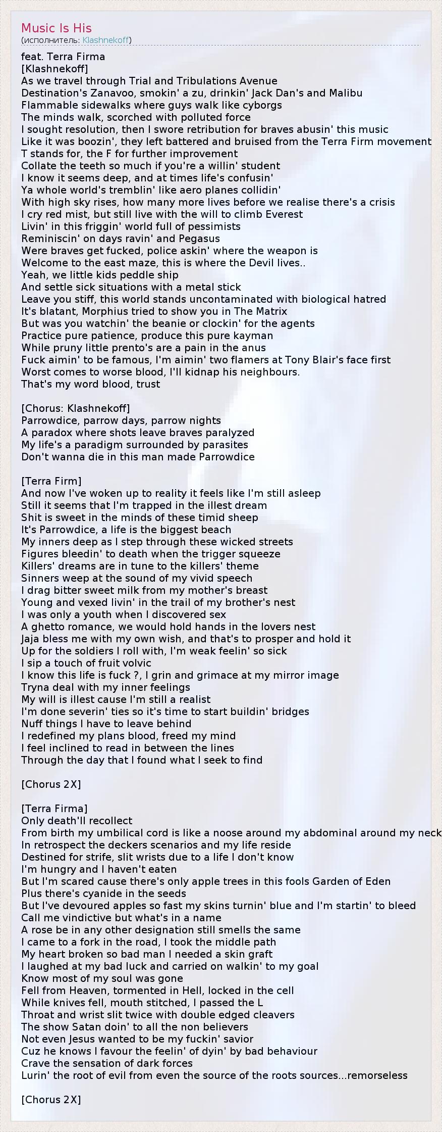 feat. Terra Firma [Klashnekoff] As we travel through Trial and Tribulations Avenue Destination's Zanavoo, smokin' a zu, drinkin' Jack Dan's and Malibu Flammable sidewalks where guys walk like cyborgs The minds walk, scorched with polluted force I sought resolution, then I swore retribution for braves abusin' this music Like it was boozin', they left battered and bruised from the Terra Firm movement T stands for, the F for further improvement Collate the teeth so much if you're a willin' student I know it seems deep, and at times life's confusin' Ya whole world's tremblin' like aero planes collidin' With high sky rises, how many more lives before we realise there's a crisis I cry red mist, but still live with the will to climb Everest Livin' in this friggin' world full of pessimists Reminiscin' on days ravin' and Pegasus Were braves get fucked, police askin' where the weapon is Welcome to the east maze, this is where the Devil lives.. Yeah, we little kids peddle ship And settle sick situations with a metal stick Leave you stiff, this world stands uncontaminated with biological hatred It's blatant, Morphius tried to show you in The Matrix But was you watchin' the beanie or clockin' for the agents Practice pure patience, produce this pure kayman While pruny little prento's are a pain in the anus Fuck aimin' to be famous, I'm aimin' two flamers at Tony Blair's face first Worst comes to worse blood, I'll kidnap his neighbours. That's my word blood, trust [Chorus: Klashnekoff] Parrowdice, parrow days, parrow nights A paradox where shots leave braves paralyzed My life's a paradigm surrounded by parasites Don't wanna die in this man made Parrowdice [Terra Firm] And now I've woken up to reality it feels like I'm still asleep Still it seems that I'm trapped in the illest dream Shit is sweet in the minds of these timid sheep It's Parrowdice, a life is the biggest beach My inners deep as I step through these wicked streets Figures bleedin' to death when the trigger squeeze Killers' dreams are in tune to the killers' theme Sinners weep at the sound of my vivid speech I drag bitter sweet milk from my mother's breast Young and vexed livin' in the trail of my brother's nest I was only a youth when I discovered sex A ghetto romance, we would hold hands in the lovers nest Jaja bless me with my own wish, and that's to prosper and hold it Up for the soldiers I roll with, I'm weak feelin' so sick I sip a touch of fruit volvic I know this life is fuck ?, I grin and grimace at my mirror image Tryna deal with my inner feelings My will is illest cause I'm still a realist I'm done severin' ties so it's time to start buildin' bridges Nuff things I have to leave behind I redefined my plans blood, freed my mind I feel inclined to read in between the lines Through the day that I found what I seek to find [Chorus 2X] [Terra Firma] Only death'll recollect From birth my umbilical cord is like a noose around my abdominal around my neck In retrospect the deckers scenarios and my life reside Destined for strife, slit wrists due to a life I don't know I'm hungry and I haven't eaten But I'm scared cause there's only apple trees in this fools Garden of Eden Plus there's cyanide in the seeds But I've devoured apples so fast my skins turnin' blue and I'm startin' to bleed Call me vindictive but what's in a name A rose be in any other designation still smells the same I came to a fork in the road, I took the middle path My heart broken so bad man I needed a skin graft I laughed at my bad luck and carried on walkin' to my goal Know most of my soul was gone Fell from Heaven, tormented in Hell, locked in the cell While knives fell, mouth stitched, I passed the L Throat and wrist slit twice with double edged cleavers The show Satan doin' to all the non believers Not even Jesus wanted to be my fuckin' savior Cuz he knows I favour the feelin' of dyin' by bad behaviour Crave the sensation of dark forces Lurin' the root of evil from even the source of the roots sources...remorseless [Chorus 2X]
