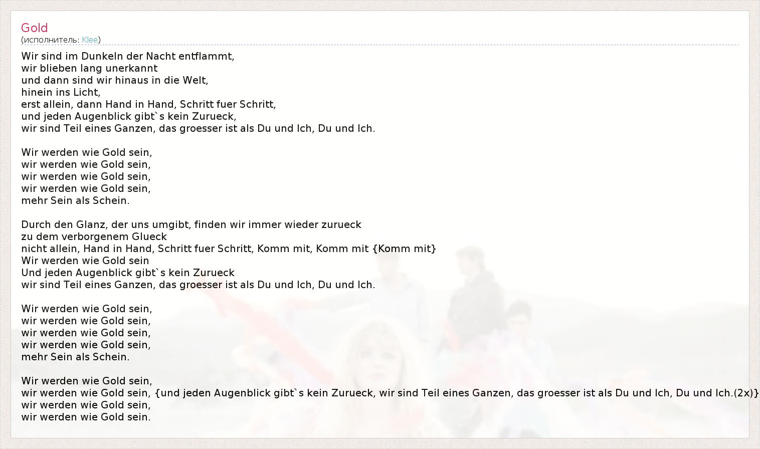 wir werden wie Gold sein, {und jeden Augenblick gibt`s kein Zurueck, wir sind Teil eines Ganzen, das groesser ist als Du und Ich, Du und Ich.(2x)}