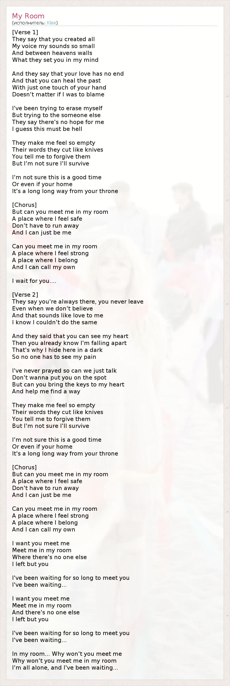 [Verse 1] They say that you created all My voice my sounds so small And between heavens walls What they set you in my mind And they say that your love has no end And that you can heal the past With just one touch of your hand Doesn't matter if I was to blame I've been trying to erase myself But trying to the someone else They say there's no hope for me I guess this must be hell They make me feel so empty Their words they cut like knives You tell me to forgive them But I'm not sure I'll survive I'm not sure this is a good time Or even if your home It's a long long way from your throne [Chorus] But can you meet me in my room A place where I feel safe Don't have to run away And I can just be me Can you meet me in my room A place where I feel strong A place where I belong And I can call my own I wait for you.... [Verse 2] They say you're always there, you never leave Even when we don't believe And that sounds like love to me I know I couldn't do the same And they said that you can see my heart Then you already know I'm falling apart That's why I hide here in a dark So no one has to see my pain I've never prayed so can we just talk Don't wanna put you on the spot But can you bring the keys to my heart And help me find a way They make me feel so empty Their words they cut like knives You tell me to forgive them But I'm not sure I'll survive I'm not sure this is a good time Or even if your home It's a long long way from your throne [Chorus] But can you meet me in my room A place where I feel safe Don't have to run away And I can just be me Can you meet me in my room A place where I feel strong A place where I belong And I can call my own I want you meet me Meet me in my room Where there's no one else I left but you I've been waiting for so long to meet you I've been waiting... I want you meet me Meet me in my room And there's no one else I left but you I've been waiting for so long to meet you I've been waiting... In my room... Why won't you meet me Why won't you meet me in my room I'm all alone, and I've been waiting...