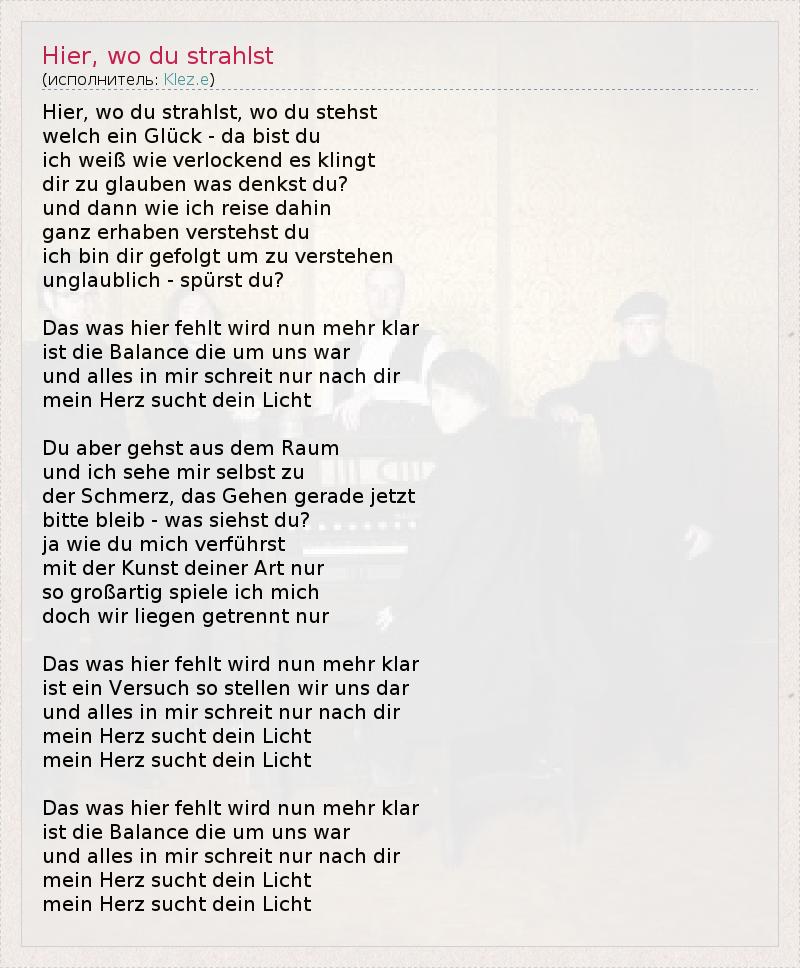 Хир , горе -дю strahlst , WO дю stehst Уэлч Эйн Глюк - да БИСТ дю ич Вайс Wie verlockend эс klingt реж цу glauben был denkst дю ? унд Данн Wie ич Reise dahin Ганц erhaben verstehst дю ич бен реж gefolgt мкм цу Verstehen Unglaublich - spürst дю ? Das было Хир FEHLT вирд монахиня Mehr Клар IST умереть Баланс умереть UM UNS войну унд аллес в мир schreit нур нач реж Mein Herz Sucht Dein Licht Du Aber gehst AUS DEM Raum унд ич sehe мир Selbst цу дер Schmerz , дас Gehen Gerade Jetzt Bitte Bleib - был siehst дю ? JA Wie Du Mich verführst мит дер Kunst Deiner Art нур так Großartig Spiele ич Mich Дочь Wir Liegen getrennt нур Das было Хир FEHLT вирд монахиня Mehr Клар IST Эйн Versuch так Stellen ДМИ UNS дар унд аллес в мир schreit нур нач реж Mein Herz Sucht Dein Licht Mein Herz Sucht Dein Licht Das было Хир FEHLT вирд монахиня Mehr Клар IST умереть Баланс умереть UM UNS войну унд аллес в мир schreit нур нач реж Mein Herz Sucht Dein Licht Mein Herz Sucht Dein Licht