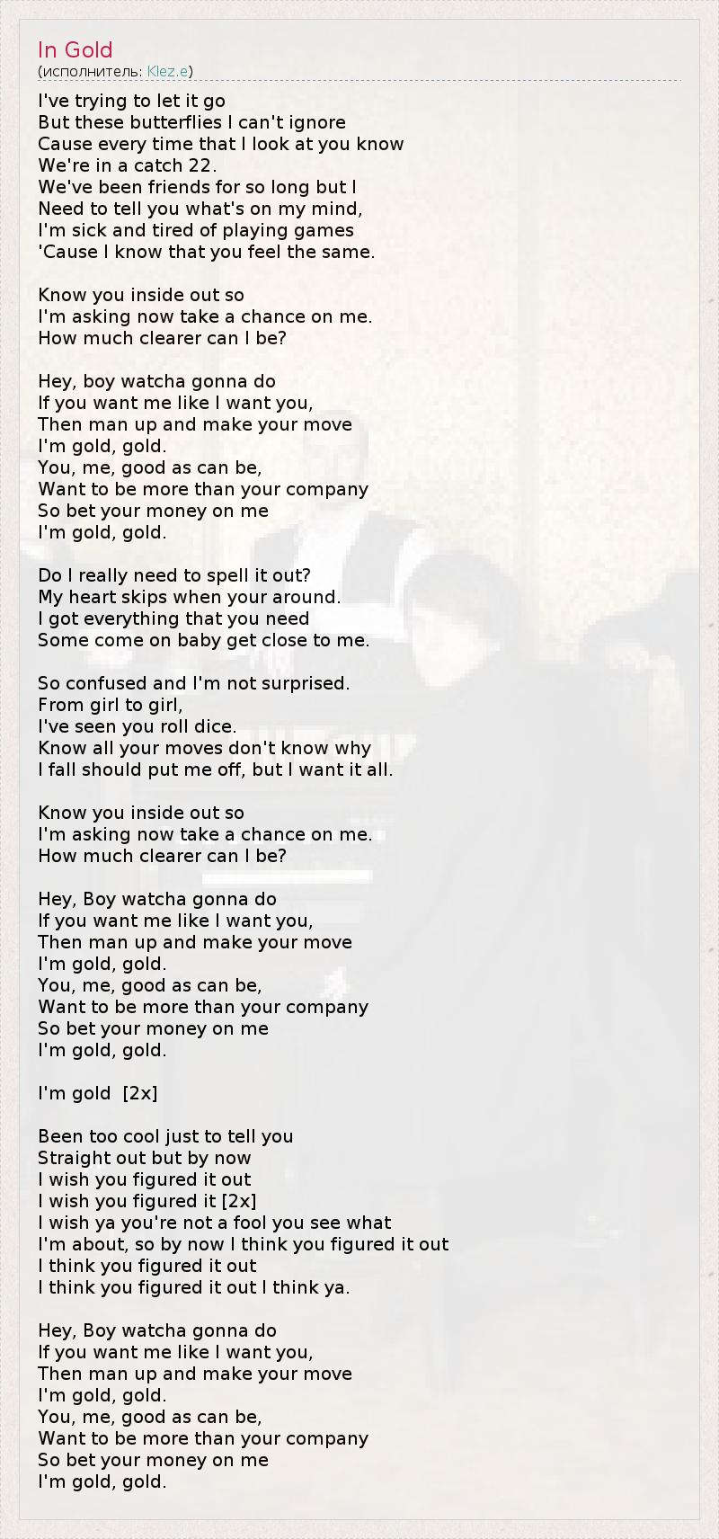 I've trying to let it go But these butterflies I can't ignore Cause every time that I look at you know We're in a catch 22. We've been friends for so long but I Need to tell you what's on my mind, I'm sick and tired of playing games 'Cause I know that you feel the same. Know you inside out so I'm asking now take a chance on me. How much clearer can I be? Hey, boy watcha gonna do If you want me like I want you, Then man up and make your move I'm gold, gold. You, me, good as can be, Want to be more than your company So bet your money on me I'm gold, gold. Do I really need to spell it out? My heart skips when your around. I got everything that you need Some come on baby get close to me. So confused and I'm not surprised. From girl to girl, I've seen you roll dice. Know all your moves don't know why I fall should put me off, but I want it all. Know you inside out so I'm asking now take a chance on me. How much clearer can I be? Hey, Boy watcha gonna do If you want me like I want you, Then man up and make your move I'm gold, gold. You, me, good as can be, Want to be more than your company So bet your money on me I'm gold, gold. I'm gold [2x] Been too cool just to tell you Straight out but by now I wish you figured it out I wish you figured it [2x] I wish ya you're not a fool you see what I'm about, so by now I think you figured it out I think you figured it out I think you figured it out I think ya. Hey, Boy watcha gonna do If you want me like I want you, Then man up and make your move I'm gold, gold. You, me, good as can be, Want to be more than your company So bet your money on me I'm gold, gold.