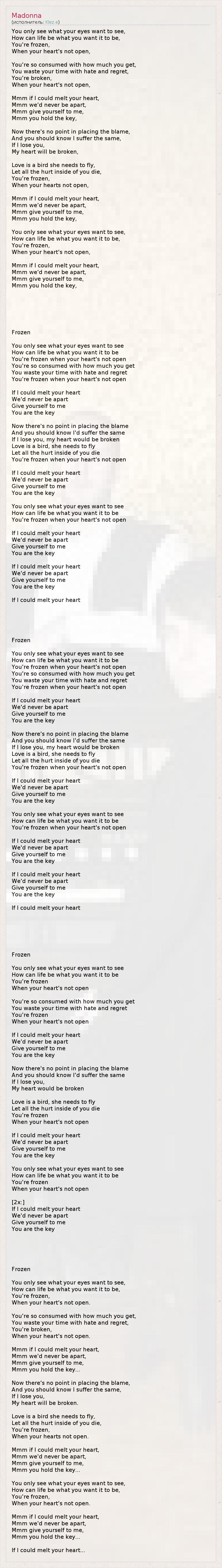 You only see what your eyes want to see, How can life be what you want it to be, You're frozen, When your heart's not open, You're so consumed with how much you get, You waste your time with hate and regret, You're broken, When your heart's not open, Mmm if I could melt your heart, Mmm we'd never be apart, Mmm give yourself to me, Mmm you hold the key, Now there's no point in placing the blame, And you should know I suffer the same, If I lose you, My heart will be broken, Love is a bird she needs to fly, Let all the hurt inside of you die, You're frozen, When your hearts not open, Mmm if I could melt your heart, Mmm we'd never be apart, Mmm give yourself to me, Mmm you hold the key, You only see what your eyes want to see, How can life be what you want it to be, You're frozen, When your heart's not open, Mmm if I could melt your heart, Mmm we'd never be apart, Mmm give yourself to me, Mmm you hold the key, Frozen You only see what your eyes want to see How can life be what you want it to be You're frozen when your heart's not open You're so consumed with how much you get You waste your time with hate and regret You're frozen when your heart's not open If I could melt your heart We'd never be apart Give yourself to me You are the key Now there's no point in placing the blame And you should know I'd suffer the same If I lose you, my heart would be broken Love is a bird, she needs to fly Let all the hurt inside of you die You're frozen when your heart's not open If I could melt your heart We'd never be apart Give yourself to me You are the key You only see what your eyes want to see How can life be what you want it to be You're frozen when your heart's not open If I could melt your heart We'd never be apart Give yourself to me You are the key If I could melt your heart We'd never be apart Give yourself to me You are the key If I could melt your heart Frozen You only see what your eyes want to see How can life be what you want it to be You're frozen when your heart's not open You're so consumed with how much you get You waste your time with hate and regret You're frozen when your heart's not open If I could melt your heart We'd never be apart Give yourself to me You are the key Now there's no point in placing the blame And you should know I'd suffer the same If I lose you, my heart would be broken Love is a bird, she needs to fly Let all the hurt inside of you die You're frozen when your heart's not open If I could melt your heart We'd never be apart Give yourself to me You are the key You only see what your eyes want to see How can life be what you want it to be You're frozen when your heart's not open If I could melt your heart We'd never be apart Give yourself to me You are the key If I could melt your heart We'd never be apart Give yourself to me You are the key If I could melt your heart Frozen You only see what your eyes want to see How can life be what you want it to be You're frozen When your heart's not open You're so consumed with how much you get You waste your time with hate and regret You're frozen When your heart's not open If I could melt your heart We'd never be apart Give yourself to me You are the key Now there's no point in placing the blame And you should know I'd suffer the same If I lose you, My heart would be broken Love is a bird, she needs to fly Let all the hurt inside of you die You're frozen When your heart's not open If I could melt your heart We'd never be apart Give yourself to me You are the key You only see what your eyes want to see How can life be what you want it to be You're frozen When your heart's not open [2x:] If I could melt your heart We'd never be apart Give yourself to me You are the key Frozen You only see what your eyes want to see, How can life be what you want it to be, You're frozen, When your heart's not open. You're so consumed with how much you get, You waste your time with hate and regret, You're broken, When your heart's not open. Mmm if I could melt your heart, Mmm we'd never be apart, Mmm give yourself to me, Mmm you hold the key... Now there's no point in placing the blame, And you should know I suffer the same, If I lose you, My heart will be broken. Love is a bird she needs to fly, Let all the hurt inside of you die, You're frozen, When your hearts not open. Mmm if I could melt your heart, Mmm we'd never be apart, Mmm give yourself to me, Mmm you hold the key... You only see what your eyes want to see, How can life be what you want it to be, You're frozen, When your heart's not open. Mmm if I could melt your heart, Mmm we'd never be apart, Mmm give yourself to me, Mmm you hold the key... If I could melt your heart...