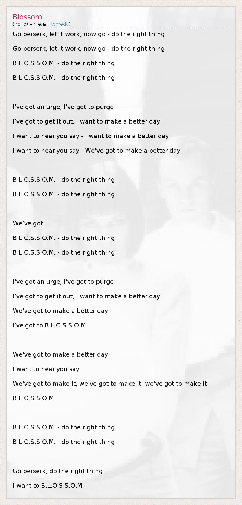Go berserk, let it work, now go - do the right thing Go berserk, let it work, now go - do the right thing B.L.O.S.S.O.M. - do the right thing B.L.O.S.S.O.M. - do the right thing I've got an urge, I've got to purge I've got to get it out, I want to make a better day I want to hear you say - I want to make a better day I want to hear you say - We've got to make a better day B.L.O.S.S.O.M. - do the right thing B.L.O.S.S.O.M. - do the right thing We've got B.L.O.S.S.O.M. - do the right thing B.L.O.S.S.O.M. - do the right thing I've got an urge, I've got to purge I've got to get it out, I want to make a better day We've got to make a better day I've got to B.L.O.S.S.O.M. We've got to make a better day I want to hear you say We've got to make it, we've got to make it, we've got to make it B.L.O.S.S.O.M. B.L.O.S.S.O.M. - do the right thing B.L.O.S.S.O.M. - do the right thing Go berserk, do the right thing I want to B.L.O.S.S.O.M.
