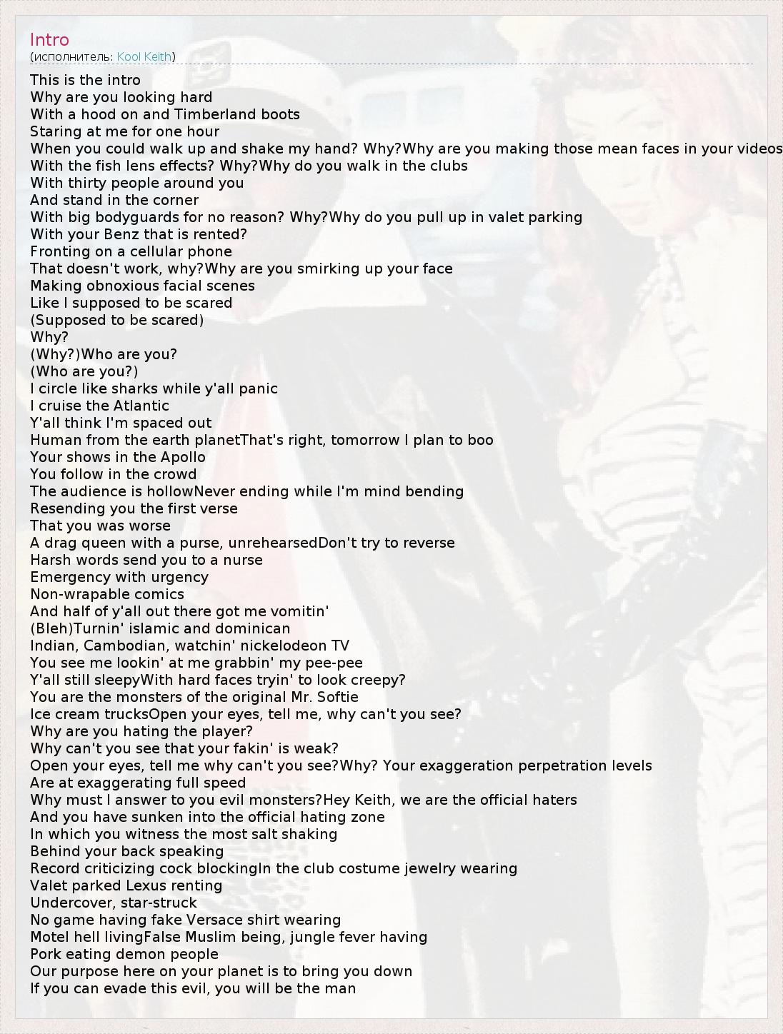 This is the intro Why are you looking hard With a hood on and Timberland boots Staring at me for one hour When you could walk up and shake my hand? Why?Why are you making those mean faces in your videos With the fish lens effects? Why?Why do you walk in the clubs With thirty people around you And stand in the corner With big bodyguards for no reason? Why?Why do you pull up in valet parking With your Benz that is rented? Fronting on a cellular phone That doesn't work, why?Why are you smirking up your face Making obnoxious facial scenes Like I supposed to be scared (Supposed to be scared) Why? (Why?)Who are you? (Who are you?) I circle like sharks while y'all panic I cruise the Atlantic Y'all think I'm spaced out Human from the earth planetThat's right, tomorrow I plan to boo Your shows in the Apollo You follow in the crowd The audience is hollowNever ending while I'm mind bending Resending you the first verse That you was worse A drag queen with a purse, unrehearsedDon't try to reverse Harsh words send you to a nurse Emergency with urgency Non-wrapable comics And half of y'all out there got me vomitin' (Bleh)Turnin' islamic and dominican Indian, Cambodian, watchin' nickelodeon TV You see me lookin' at me grabbin' my pee-pee Y'all still sleepyWith hard faces tryin' to look creepy? You are the monsters of the original Mr. Softie Ice cream trucksOpen your eyes, tell me, why can't you see? Why are you hating the player? Why can't you see that your fakin' is weak? Open your eyes, tell me why can't you see?Why? Your exaggeration perpetration levels Are at exaggerating full speed Why must I answer to you evil monsters?Hey Keith, we are the official haters And you have sunken into the official hating zone In which you witness the most salt shaking Behind your back speaking Record criticizing cock blockingIn the club costume jewelry wearing Valet parked Lexus renting Undercover, star-struck No game having fake Versace shirt wearing Motel hell livingFalse Muslim being, jungle fever having Pork eating demon people Our purpose here on your planet is to bring you down If you can evade this evil, you will be the man