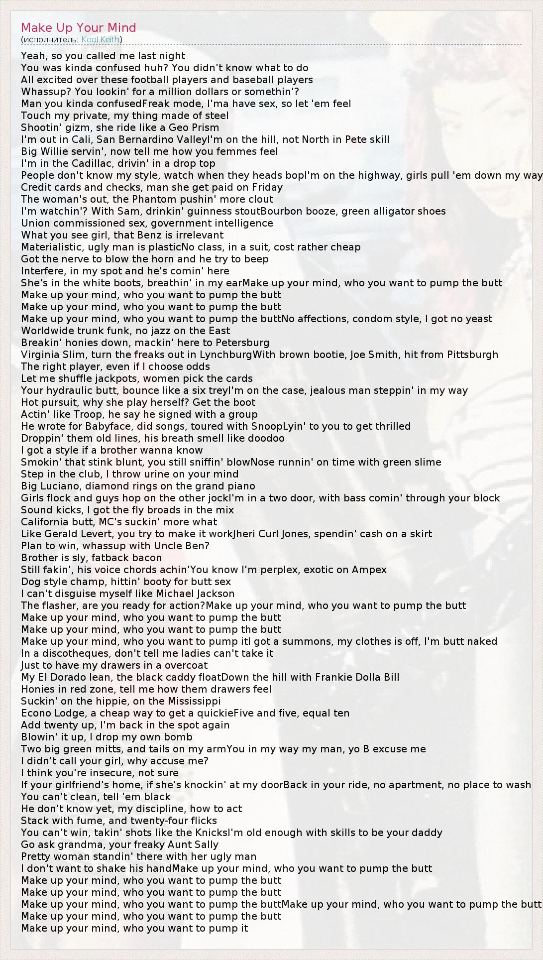 Yeah, so you called me last night You was kinda confused huh? You didn't know what to do All excited over these football players and baseball players Whassup? You lookin' for a million dollars or somethin'? Man you kinda confusedFreak mode, I'ma have sex, so let 'em feel Touch my private, my thing made of steel Shootin' gizm, she ride like a Geo Prism I'm out in Cali, San Bernardino ValleyI'm on the hill, not North in Pete skill Big Willie servin', now tell me how you femmes feel I'm in the Cadillac, drivin' in a drop top People don't know my style, watch when they heads bopI'm on the highway, girls pull 'em down my way Credit cards and checks, man she get paid on Friday The woman's out, the Phantom pushin' more clout I'm watchin'? With Sam, drinkin' guinness stoutBourbon booze, green alligator shoes Union commissioned sex, government intelligence What you see girl, that Benz is irrelevant Materialistic, ugly man is plasticNo class, in a suit, cost rather cheap Got the nerve to blow the horn and he try to beep Interfere, in my spot and he's comin' here She's in the white boots, breathin' in my earMake up your mind, who you want to pump the butt Make up your mind, who you want to pump the butt Make up your mind, who you want to pump the butt Make up your mind, who you want to pump the buttNo affections, condom style, I got no yeast Worldwide trunk funk, no jazz on the East Breakin' honies down, mackin' here to Petersburg Virginia Slim, turn the freaks out in LynchburgWith brown bootie, Joe Smith, hit from Pittsburgh The right player, even if I choose odds Let me shuffle jackpots, women pick the cards Your hydraulic butt, bounce like a six treyI'm on the case, jealous man steppin' in my way Hot pursuit, why she play herself? Get the boot Actin' like Troop, he say he signed with a group He wrote for Babyface, did songs, toured with SnoopLyin' to you to get thrilled Droppin' them old lines, his breath smell like doodoo I got a style if a brother wanna know Smokin' that stink blunt, you still sniffin' blowNose runnin' on time with green slime Step in the club, I throw urine on your mind Big Luciano, diamond rings on the grand piano Girls flock and guys hop on the other jockI'm in a two door, with bass comin' through your block Sound kicks, I got the fly broads in the mix California butt, MC's suckin' more what Like Gerald Levert, you try to make it workJheri Curl Jones, spendin' cash on a skirt Plan to win, whassup with Uncle Ben? Brother is sly, fatback bacon Still fakin', his voice chords achin'You know I'm perplex, exotic on Ampex Dog style champ, hittin' booty for butt sex I can't disguise myself like Michael Jackson The flasher, are you ready for action?Make up your mind, who you want to pump the butt Make up your mind, who you want to pump the butt Make up your mind, who you want to pump the butt Make up your mind, who you want to pump itI got a summons, my clothes is off, I'm butt naked In a discotheques, don't tell me ladies can't take it Just to have my drawers in a overcoat My El Dorado lean, the black caddy floatDown the hill with Frankie Dolla Bill Honies in red zone, tell me how them drawers feel Suckin' on the hippie, on the Mississippi Econo Lodge, a cheap way to get a quickieFive and five, equal ten Add twenty up, I'm back in the spot again Blowin' it up, I drop my own bomb Two big green mitts, and tails on my armYou in my way my man, yo B excuse me I didn't call your girl, why accuse me? I think you're insecure, not sure If your girlfriend's home, if she's knockin' at my doorBack in your ride, no apartment, no place to wash You can't clean, tell 'em black He don't know yet, my discipline, how to act Stack with fume, and twenty-four flicks You can't win, takin' shots like the KnicksI'm old enough with skills to be your daddy Go ask grandma, your freaky Aunt Sally Pretty woman standin' there with her ugly man I don't want to shake his handMake up your mind, who you want to pump the butt Make up your mind, who you want to pump the butt Make up your mind, who you want to pump the butt Make up your mind, who you want to pump the buttMake up your mind, who you want to pump the butt Make up your mind, who you want to pump the butt Make up your mind, who you want to pump it