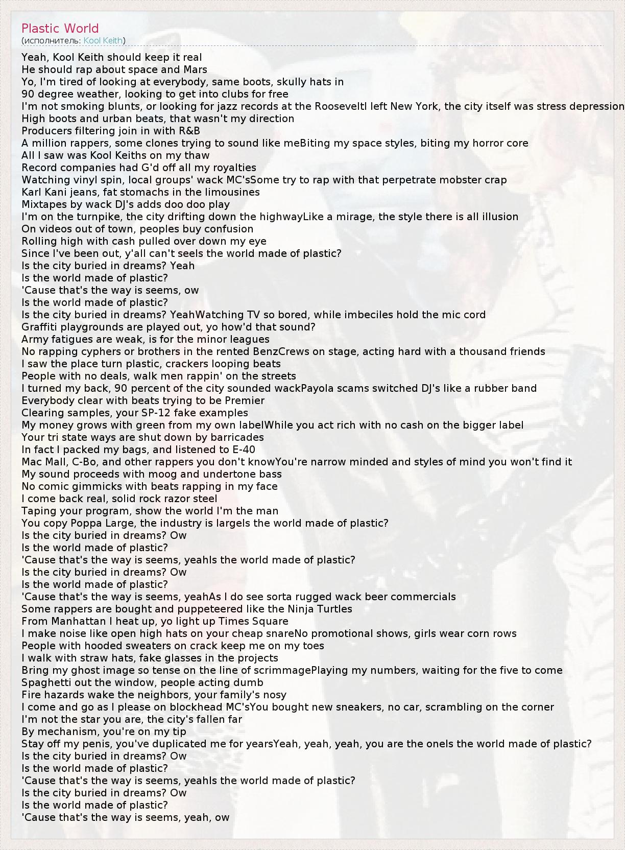 Yeah, Kool Keith should keep it real He should rap about space and Mars Yo, I'm tired of looking at everybody, same boots, skully hats in 90 degree weather, looking to get into clubs for free I'm not smoking blunts, or looking for jazz records at the RooseveltI left New York, the city itself was stress depression High boots and urban beats, that wasn't my direction Producers filtering join in with R&B A million rappers, some clones trying to sound like meBiting my space styles, biting my horror core All I saw was Kool Keiths on my thaw Record companies had G'd off all my royalties Watching vinyl spin, local groups' wack MC'sSome try to rap with that perpetrate mobster crap Karl Kani jeans, fat stomachs in the limousines Mixtapes by wack DJ's adds doo doo play I'm on the turnpike, the city drifting down the highwayLike a mirage, the style there is all illusion On videos out of town, peoples buy confusion Rolling high with cash pulled over down my eye Since I've been out, y'all can't seeIs the world made of plastic? Is the city buried in dreams? Yeah Is the world made of plastic? 'Cause that's the way is seems, ow Is the world made of plastic? Is the city buried in dreams? YeahWatching TV so bored, while imbeciles hold the mic cord Graffiti playgrounds are played out, yo how'd that sound? Army fatigues are weak, is for the minor leagues No rapping cyphers or brothers in the rented BenzCrews on stage, acting hard with a thousand friends I saw the place turn plastic, crackers looping beats People with no deals, walk men rappin' on the streets I turned my back, 90 percent of the city sounded wackPayola scams switched DJ's like a rubber band Everybody clear with beats trying to be Premier Clearing samples, your SP-12 fake examples My money grows with green from my own labelWhile you act rich with no cash on the bigger label Your tri state ways are shut down by barricades In fact I packed my bags, and listened to E-40 Mac Mall, C-Bo, and other rappers you don't knowYou're narrow minded and styles of mind you won't find it My sound proceeds with moog and undertone bass No comic gimmicks with beats rapping in my face I come back real, solid rock razor steel Taping your program, show the world I'm the man You copy Poppa Large, the industry is largeIs the world made of plastic? Is the city buried in dreams? Ow Is the world made of plastic? 'Cause that's the way is seems, yeahIs the world made of plastic? Is the city buried in dreams? Ow Is the world made of plastic? 'Cause that's the way is seems, yeahAs I do see sorta rugged wack beer commercials Some rappers are bought and puppeteered like the Ninja Turtles From Manhattan I heat up, yo light up Times Square I make noise like open high hats on your cheap snareNo promotional shows, girls wear corn rows People with hooded sweaters on crack keep me on my toes I walk with straw hats, fake glasses in the projects Bring my ghost image so tense on the line of scrimmagePlaying my numbers, waiting for the five to come Spaghetti out the window, people acting dumb Fire hazards wake the neighbors, your family's nosy I come and go as I please on blockhead MC'sYou bought new sneakers, no car, scrambling on the corner I'm not the star you are, the city's fallen far By mechanism, you're on my tip Stay off my penis, you've duplicated me for yearsYeah, yeah, yeah, you are the oneIs the world made of plastic? Is the city buried in dreams? Ow Is the world made of plastic? 'Cause that's the way is seems, yeahIs the world made of plastic? Is the city buried in dreams? Ow Is the world made of plastic? 'Cause that's the way is seems, yeah, ow