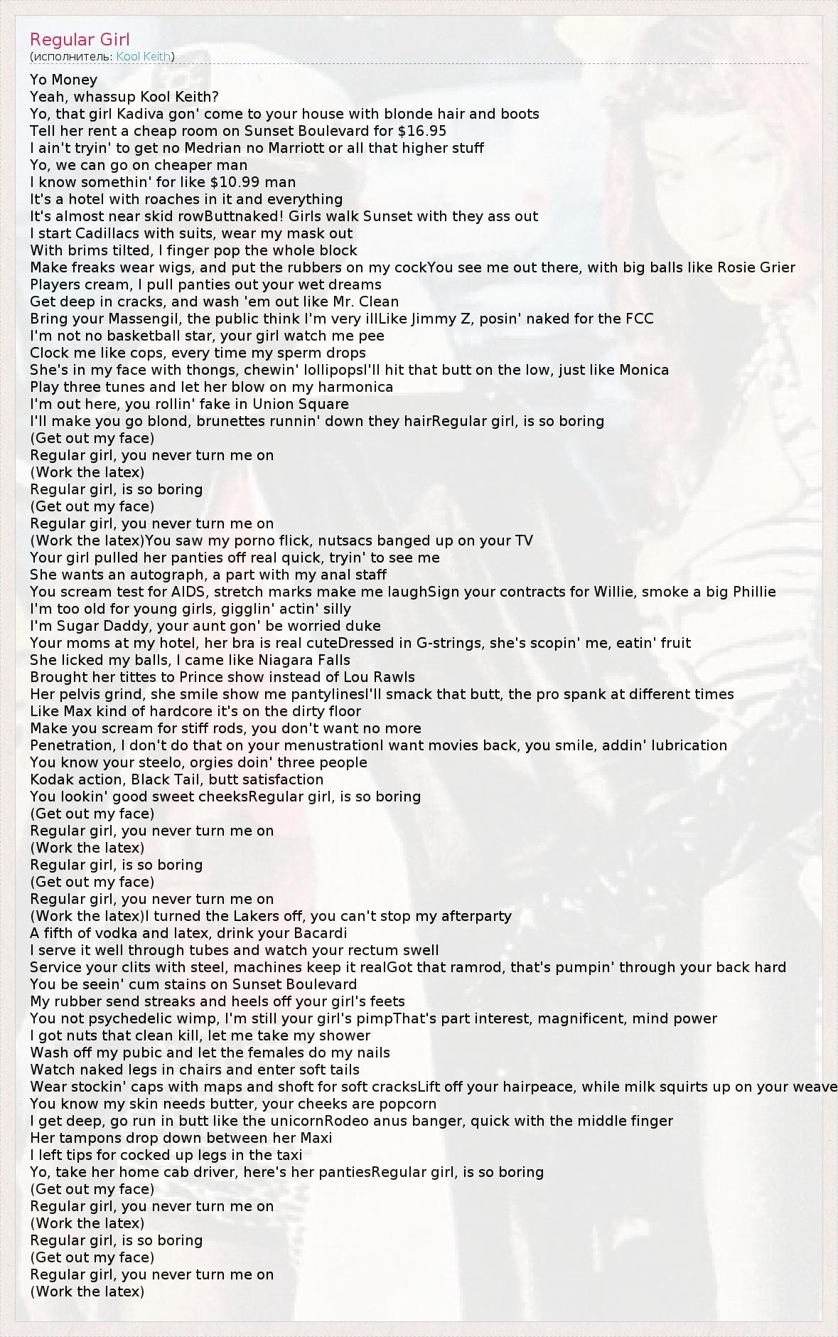 Yo Money Yeah, whassup Kool Keith? Yo, that girl Kadiva gon' come to your house with blonde hair and boots Tell her rent a cheap room on Sunset Boulevard for $16.95 I ain't tryin' to get no Medrian no Marriott or all that higher stuff Yo, we can go on cheaper man I know somethin' for like $10.99 man It's a hotel with roaches in it and everything It's almost near skid rowButtnaked! Girls walk Sunset with they ass out I start Cadillacs with suits, wear my mask out With brims tilted, I finger pop the whole block Make freaks wear wigs, and put the rubbers on my cockYou see me out there, with big balls like Rosie Grier Players cream, I pull panties out your wet dreams Get deep in cracks, and wash 'em out like Mr. Clean Bring your Massengil, the public think I'm very illLike Jimmy Z, posin' naked for the FCC I'm not no basketball star, your girl watch me pee Clock me like cops, every time my sperm drops She's in my face with thongs, chewin' lollipopsI'll hit that butt on the low, just like Monica Play three tunes and let her blow on my harmonica I'm out here, you rollin' fake in Union Square I'll make you go blond, brunettes runnin' down they hairRegular girl, is so boring (Get out my face) Regular girl, you never turn me on (Work the latex) Regular girl, is so boring (Get out my face) Regular girl, you never turn me on (Work the latex)You saw my porno flick, nutsacs banged up on your TV Your girl pulled her panties off real quick, tryin' to see me She wants an autograph, a part with my anal staff You scream test for AIDS, stretch marks make me laughSign your contracts for Willie, smoke a big Phillie I'm too old for young girls, gigglin' actin' silly I'm Sugar Daddy, your aunt gon' be worried duke Your moms at my hotel, her bra is real cuteDressed in G-strings, she's scopin' me, eatin' fruit She licked my balls, I came like Niagara Falls Brought her tittes to Prince show instead of Lou Rawls Her pelvis grind, she smile show me pantylinesI'll smack that butt, the pro spank at different times Like Max kind of hardcore it's on the dirty floor Make you scream for stiff rods, you don't want no more Penetration, I don't do that on your menustrationI want movies back, you smile, addin' lubrication You know your steelo, orgies doin' three people Kodak action, Black Tail, butt satisfaction You lookin' good sweet cheeksRegular girl, is so boring (Get out my face) Regular girl, you never turn me on (Work the latex) Regular girl, is so boring (Get out my face) Regular girl, you never turn me on (Work the latex)I turned the Lakers off, you can't stop my afterparty A fifth of vodka and latex, drink your Bacardi I serve it well through tubes and watch your rectum swell Service your clits with steel, machines keep it realGot that ramrod, that's pumpin' through your back hard You be seein' cum stains on Sunset Boulevard My rubber send streaks and heels off your girl's feets You not psychedelic wimp, I'm still your girl's pimpThat's part interest, magnificent, mind power I got nuts that clean kill, let me take my shower Wash off my pubic and let the females do my nails Watch naked legs in chairs and enter soft tails Wear stockin' caps with maps and shoft for soft cracksLift off your hairpeace, while milk squirts up on your weave You know my skin needs butter, your cheeks are popcorn I get deep, go run in butt like the unicornRodeo anus banger, quick with the middle finger Her tampons drop down between her Maxi I left tips for cocked up legs in the taxi Yo, take her home cab driver, here's her pantiesRegular girl, is so boring (Get out my face) Regular girl, you never turn me on (Work the latex) Regular girl, is so boring (Get out my face) Regular girl, you never turn me on (Work the latex)