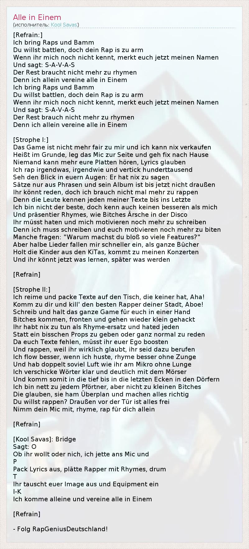[Refrain:] Ich bring Raps und Bamm Du willst battlen, doch dein Rap is zu arm Wenn ihr mich noch nicht kennt, merkt euch jetzt meinen Namen Und sagt: S-A-V-A-S Der Rest braucht nicht mehr zu rhymen Denn ich allein vereine alle in Einem Ich bring Raps und Bamm Du willst battlen, doch dein Rap is zu arm Wenn ihr mich noch nicht kennt, merkt euch jetzt meinen Namen Und sagt: S-A-V-A-S Der Rest brauch nicht mehr zu rhymen Denn ich allein vereine alle in Einem [Strophe I:] Das Game ist nicht mehr fair zu mir und ich kann nix verkaufen Heißt im Grunde, leg das Mic zur Seite und geh fix nach Hause Niemand kann mehr eure Platten hören, Lyrics glauben Ich rap irgendwas, irgendwie und vertick hunderttausend Seh den Blick in euern Augen: Er hat nix zu sagen Sätze nur aus Phrasen und sein Album ist bis jetzt nicht draußen Ihr könnt reden, doch ich brauch nicht mal mehr zu rappen Denn die Leute kennen jeden meiner Texte bis ins Letzte Ich bin nicht der beste, doch kenn auch keinen besseren als mich Und präsentier Rhymes, wie Bitches Ärsche in der Disco Ihr müsst haten und mich motivieren noch mehr zu schreiben Denn ich muss schreiben und euch motivieren noch mehr zu biten Manche fragen: "Warum machst du bloß so viele Features?" Aber halbe Lieder fallen mir schneller ein, als ganze Bücher Holt die Kinder aus den KiTas, kommt zu meinen Konzerten Und ihr könnt jetzt was lernen, später was werden [Refrain] [Strophe II:] Ich reime und packe Texte auf den Tisch, die keiner hat, Aha! Komm zu dir und kill' den besten Rapper deiner Stadt, Aboe! Schreib und halt das ganze Game für euch in einer Hand Bitches kommen, fronten und gehen wieder klein gehackt Ihr habt nix zu tun als Rhyme-ersatz und hated jeden Statt ein bisschen Props zu geben oder ganz normal zu reden Da euch Texte fehlen, müsst ihr euer Ego boosten Und rappen, weil ihr wirklich glaubt, ihr seid dazu berufen Ich flow besser, wenn ich huste, rhyme besser ohne Zunge Und hab doppelt soviel Luft wie ihr am Mikro ohne Lunge Ich verschicke Wörter klar und deutlich mit dem Mörser Und komm somit in die tief bis in die letzten Ecken in den Dörfern Ich bin nett zu jedem Pförtner, aber nicht zu kleinen Bitches Die glauben, sie ham Überplan und machen alles richtig Du willst rappen? Draußen vor der Tür ist alles frei Nimm dein Mic mit, rhyme, rap für dich allein [Refrain] [Kool Savas]: Bridge Sagt: O Ob ihr wollt oder nich, ich jette ans Mic und P Pack Lyrics aus, plätte Rapper mit Rhymes, drum T Ihr tauscht euer Image aus und Equipment ein I-K Ich komme alleine und vereine alle in Einem [Refrain] - Folg RapGeniusDeutschland!
