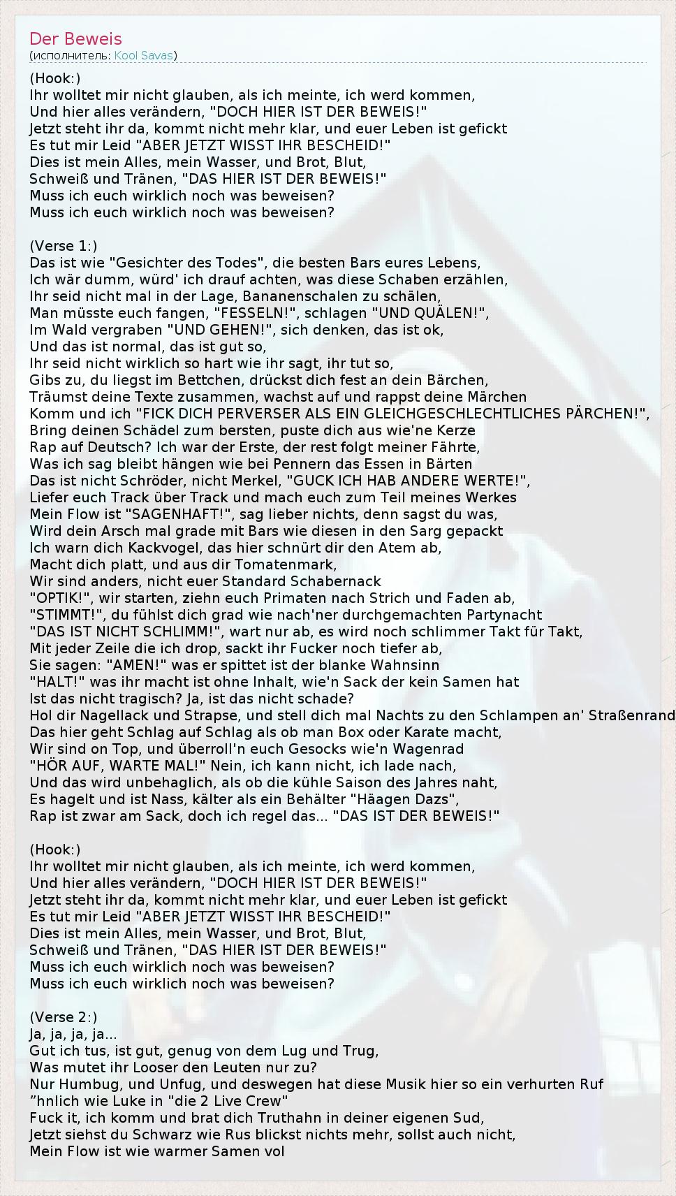 (Hook:) Ihr wolltet mir nicht glauben, als ich meinte, ich werd kommen, Und hier alles verändern, "DOCH HIER IST DER BEWEIS!" Jetzt steht ihr da, kommt nicht mehr klar, und euer Leben ist gefickt Es tut mir Leid "ABER JETZT WISST IHR BESCHEID!" Dies ist mein Alles, mein Wasser, und Brot, Blut, Schweiß und Tränen, "DAS HIER IST DER BEWEIS!" Muss ich euch wirklich noch was beweisen? Muss ich euch wirklich noch was beweisen? (Verse 1:) Das ist wie "Gesichter des Todes", die besten Bars eures Lebens, Ich wär dumm, würd' ich drauf achten, was diese Schaben erzählen, Ihr seid nicht mal in der Lage, Bananenschalen zu schälen, Man müsste euch fangen, "FESSELN!", schlagen "UND QUÄLEN!", Im Wald vergraben "UND GEHEN!", sich denken, das ist ok, Und das ist normal, das ist gut so, Ihr seid nicht wirklich so hart wie ihr sagt, ihr tut so, Gibs zu, du liegst im Bettchen, drückst dich fest an dein Bärchen, Träumst deine Texte zusammen, wachst auf und rappst deine Märchen Komm und ich "FICK DICH PERVERSER ALS EIN GLEICHGESCHLECHTLICHES PÄRCHEN!", Bring deinen Schädel zum bersten, puste dich aus wie'ne Kerze Rap auf Deutsch? Ich war der Erste, der rest folgt meiner Fährte, Was ich sag bleibt hängen wie bei Pennern das Essen in Bärten Das ist nicht Schröder, nicht Merkel, "GUCK ICH HAB ANDERE WERTE!", Liefer euch Track über Track und mach euch zum Teil meines Werkes Mein Flow ist "SAGENHAFT!", sag lieber nichts, denn sagst du was, Wird dein Arsch mal grade mit Bars wie diesen in den Sarg gepackt Ich warn dich Kackvogel, das hier schnürt dir den Atem ab, Macht dich platt, und aus dir Tomatenmark, Wir sind anders, nicht euer Standard Schabernack "OPTIK!", wir starten, ziehn euch Primaten nach Strich und Faden ab, "STIMMT!", du fühlst dich grad wie nach'ner durchgemachten Partynacht "DAS IST NICHT SCHLIMM!", wart nur ab, es wird noch schlimmer Takt für Takt, Mit jeder Zeile die ich drop, sackt ihr Fucker noch tiefer ab, Sie sagen: "AMEN!" was er spittet ist der blanke Wahnsinn "HALT!" was ihr macht ist ohne Inhalt, wie'n Sack der kein Samen hat Ist das nicht tragisch? Ja, ist das nicht schade? Hol dir Nagellack und Strapse, und stell dich mal Nachts zu den Schlampen an' Straßenrand Das hier geht Schlag auf Schlag als ob man Box oder Karate macht, Wir sind on Top, und überroll'n euch Gesocks wie'n Wagenrad "HÖR AUF, WARTE MAL!" Nein, ich kann nicht, ich lade nach, Und das wird unbehaglich, als ob die kühle Saison des Jahres naht, Es hagelt und ist Nass, kälter als ein Behälter "Häagen Dazs", Rap ist zwar am Sack, doch ich regel das... "DAS IST DER BEWEIS!" (Hook:) Ihr wolltet mir nicht glauben, als ich meinte, ich werd kommen, Und hier alles verändern, "DOCH HIER IST DER BEWEIS!" Jetzt steht ihr da, kommt nicht mehr klar, und euer Leben ist gefickt Es tut mir Leid "ABER JETZT WISST IHR BESCHEID!" Dies ist mein Alles, mein Wasser, und Brot, Blut, Schweiß und Tränen, "DAS HIER IST DER BEWEIS!" Muss ich euch wirklich noch was beweisen? Muss ich euch wirklich noch was beweisen? (Verse 2:) Ja, ja, ja, ja... Gut ich tus, ist gut, genug von dem Lug und Trug, Was mutet ihr Looser den Leuten nur zu? Nur Humbug, und Unfug, und deswegen hat diese Musik hier so ein verhurten Ruf ”hnlich wie Luke in "die 2 Live Crew" Fuck it, ich komm und brat dich Truthahn in deiner eigenen Sud, Jetzt siehst du Schwarz wie Rus blickst nichts mehr, sollst auch nicht, Mein Flow ist wie warmer Samen vol