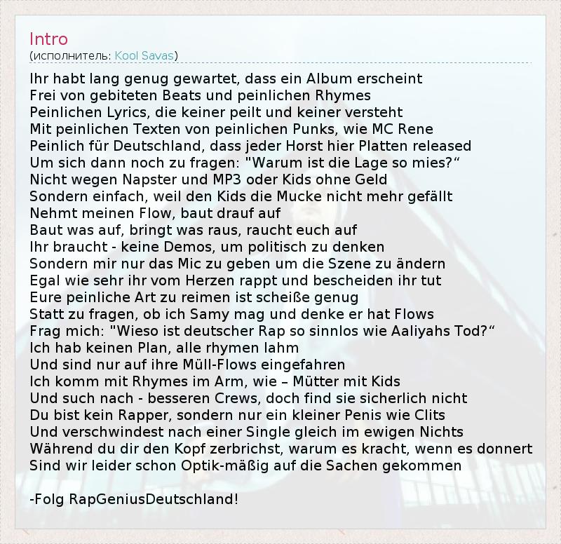 Ihr habt lang genug gewartet, dass ein Album erscheint Frei von gebiteten Beats und peinlichen Rhymes Peinlichen Lyrics, die keiner peilt und keiner versteht Mit peinlichen Texten von peinlichen Punks, wie MC Rene Peinlich für Deutschland, dass jeder Horst hier Platten released Um sich dann noch zu fragen: "Warum ist die Lage so mies?“ Nicht wegen Napster und MP3 oder Kids ohne Geld Sondern einfach, weil den Kids die Mucke nicht mehr gefällt Nehmt meinen Flow, baut drauf auf Baut was auf, bringt was raus, raucht euch auf Ihr braucht - keine Demos, um politisch zu denken Sondern mir nur das Mic zu geben um die Szene zu ändern Egal wie sehr ihr vom Herzen rappt und bescheiden ihr tut Eure peinliche Art zu reimen ist scheiße genug Statt zu fragen, ob ich Samy mag und denke er hat Flows Frag mich: "Wieso ist deutscher Rap so sinnlos wie Aaliyahs Tod?“ Ich hab keinen Plan, alle rhymen lahm Und sind nur auf ihre Müll-Flows eingefahren Ich komm mit Rhymes im Arm, wie – Mütter mit Kids Und such nach - besseren Crews, doch find sie sicherlich nicht Du bist kein Rapper, sondern nur ein kleiner Penis wie Clits Und verschwindest nach einer Single gleich im ewigen Nichts Während du dir den Kopf zerbrichst, warum es kracht, wenn es donnert Sind wir leider schon Optik-mäßig auf die Sachen gekommen -Folg RapGeniusDeutschland!