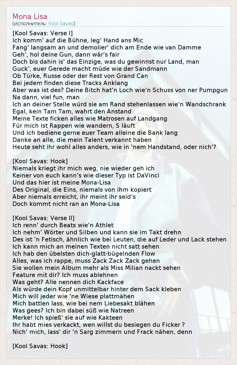 [Kool Savas: Verse I] Ich komm' auf die Bühne, leg' Hand ans Mic Fang' langsam an und demolier' dich am Ende wie van Damme Geh', hol deine Gun, dann wär's fair Doch bis dahin is' das Einzige, was du gewinnst nur Land, man Guck', euer Gerede macht müde wie der Sandmann Ob Türke, Russe oder der Rest von Grand Can Bei jedem finden diese Tracks Anklang Aber was ist des? Deine Bitch hat'n Loch wie'n Schuss von ner Pumpgun Na dann, viel fun, man Ich an deiner Stelle würd sie am Rand stehenlassen wie'n Wandschrank Egal, kein Tam Tam, wahrt den Anstand Meine Texte ficken alles wie Matrosen auf Landgang Für mich ist Rappen wie wandern, S läuft Und ich bediene gerne euer Team alleine die Bank lang Danke an alle, die mein Talent verkannt haben Heute seht ihr wohl alles anders, wie in 'nem Handstand, oder nich'? [Kool Savas: Hook] Niemals kriegt ihr mich weg, nie wieder geh ich Keiner von euch kann's wie dieser Typ ist DaVinci Und das hier ist meine Mona-Lisa Des Original, die Eins, niemals von ihm kopiert Aber niemals erreicht, ihr meint ihr seid's Doch kommt nicht ran an Mona-Lisa [Kool Savas: Verse II] Ich renn' durch Beats wie'n Athlet Ich nehm' Wörter und Silben und kann sie im Takt drehn Des ist 'n Fetisch, ähnlich wie bei Leuten, die auf Leder und Lack stehen Ich kann mich an meinen Texten nicht satt sehen Ich hab den übelsten dich-glatt-bügelnden Flow Alles, was ich rappe, muss Zack Zack Zack gehen Sie wollen mein Album mehr als Miss Milian nackt sehen Feature mit dir? Ich muss ablehnen Was geht? Alle nennen dich Kackface Als würde dein Kopf unmittelbar hinter dem Sack kleben Mich will jeder wie 'ne Wiese plattmähen Mich battlen lass, wie bei nem Liebesakt blähen Was gees? Ich bin dabei süß wie Natreen Merke! Ich spieß' sie auf wie Kakteen Ihr habt mies verkackt, wen willst du besiegen du Ficker ? Nich' mich, lass' dir 'n Sarg zimmern und Frack nähen, denn [Kool Savas: Hook]
