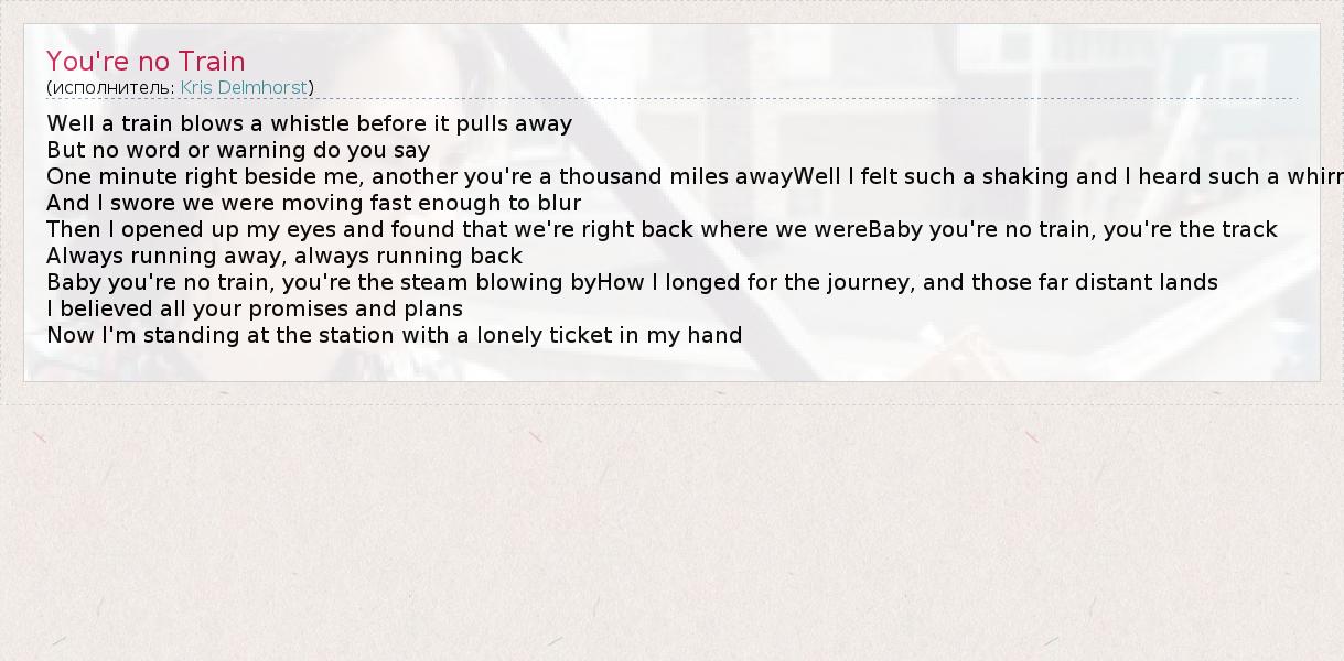 Well a train blows a whistle before it pulls away But no word or warning do you say One minute right beside me, another you're a thousand miles awayWell I felt such a shaking and I heard such a whirr And I swore we were moving fast enough to blur Then I opened up my eyes and found that we're right back where we wereBaby you're no train, you're the track Always running away, always running back Baby you're no train, you're the steam blowing byHow I longed for the journey, and those far distant lands I believed all your promises and plans Now I'm standing at the station with a lonely ticket in my hand