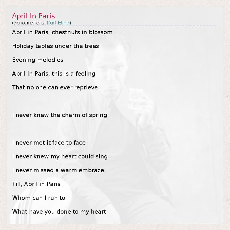 April in Paris, chestnuts in blossom Holiday tables under the trees Evening melodies April in Paris, this is a feeling That no one can ever reprieve I never knew the charm of spring I never met it face to face I never knew my heart could sing I never missed a warm embrace Till, April in Paris Whom can I run to What have you done to my heart