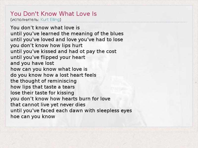 You don't know what love is until you've learned the meaning of the blues until you've loved and love you've had to lose you don't know how lips hurt until you've kissed and had ot pay the cost until you've flipped your heart and you have lost how can you know what love is do you know how a lost heart feels the thought of reminiscing how lips that taste a tears lose their taste for kissing you don't know how hearts burn for love that cannot live yet never dies until you've faced each dawn with sleepless eyes hoe can you know