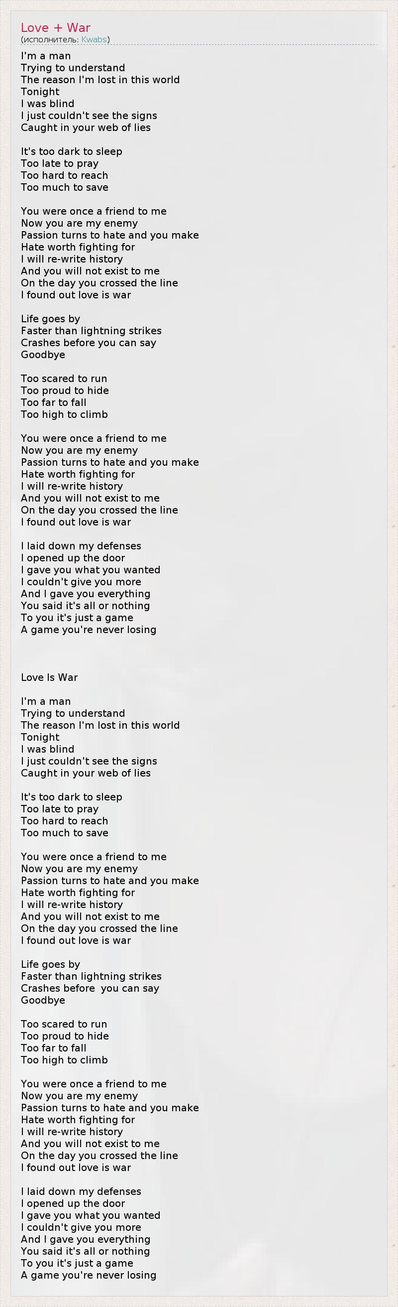 Я – человек, Пытающийся понять, Почему я потерялся в этом мире. Сегодня ночью Я был слеп, Я просто не видел знаки, Будучи пойманным в твою паутину лжи. Слишком темно, чтобы спать. Слишком поздно, чтобы молиться. Слишком сложно, чтобы постигнуть. Слишком много, чтобы спасти. Когда-то ты была мне другом, Теперь ты – мой враг. Страсть превратилась в ненависть, и ты Оправдываешь борьбу за неё. Я перепишу историю, И ты перестанешь для меня существовать. В день, когда ты перешла черту, Я узнал: любовь – это война. Жизнь проходит Быстрее, чем вспыхивают молнии, И прерывается раньше, чем ты успеваешь сказать "До свидания". Слишком испуган, чтобы бежать. Слишком горд, чтобы скрываться. Слишком далеко, чтобы упасть. Слишком высоко, чтобы подняться. Когда-то ты была мне другом, Теперь ты – мой враг. Страсть превратилась в ненависть, и ты Оправдываешь борьбу за неё. Я перепишу историю, И ты перестанешь для меня существовать. В день, когда ты перешла черту, Я узнал: любовь – это война. Я снял оборону, Я распахнул дверь, Я дал тебе то, что ты искала. Я не мог дать тебе больше, И я отдал тебе всё. Ты сказала: всё или ничего, Для тебя это просто игра, Игра, в которой ты никогда не проигрываешь. Любовь - война (перевод Элла Дементьева из Уссурийска) Я - человек, Пытающийся понять Почему я потерян в этом мире. Сегодня вечером Я был слеп. Я даже не видел знаки, Пойманный в сети твоей лжи. Слишком темно, чтобы спать, Слишком поздно, чтобы молиться, Слишком трудно, чтобы достичь, Слишком много, чтобы спасти... Некогда ты была моим другом, Теперь ты - мой враг. Страсть превращается в ненависть, и ты делаешь Ненависть стОящей борьбы за неё. Я перепишу историю, И ты перестанешь существовать для меня. В день, когда ты перешла черту, Я понял, что любовь – война. Жизнь проносится Быстрее, чем ударяет молния. Всё рушится прежде, чем ты сможешь сказать: «Прощай!» Слишком испуган, чтобы бежать, Слишком горд, чтобы скрыться, Слишком далеко, чтобы упасть, Слишком высоко, чтобы подняться. Некогда ты была моим другом, Теперь ты - мой враг. Страсть превращается в ненависть, и ты делаешь Ненависть стОящей борьбы за неё. Я перепишу историю, И ты перестанешь существовать для меня. В день, когда ты перешла черту, Я понял, что любовь - война. Я перестал защищаться, Я открыл дверь. Я дал тебе то, что ты хотела, Я не мог дать тебе больше. Я отдал тебе всё, Ведь ты сказала - всё или ничего. Для тебя это просто игра, Игра, в которой ты никогда не проигрываешь...
