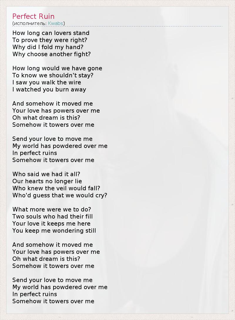 How long can lovers stand To prove they were right? Why did I fold my hand? Why choose another fight? How long would we have gone To know we shouldn't stay? I saw you walk the wire I watched you burn away And somehow it moved me Your love has powers over me Oh what dream is this? Somehow it towers over me Send your love to move me My world has powdered over me In perfect ruins Somehow it towers over me Who said we had it all? Our hearts no longer lie Who knew the veil would fall? Who'd guess that we would cry? What more were we to do? Two souls who had their fill Your love it keeps me here You keep me wondering still And somehow it moved me Your love has powers over me Oh what dream is this? Somehow it towers over me Send your love to move me My world has powdered over me In perfect ruins Somehow it towers over me