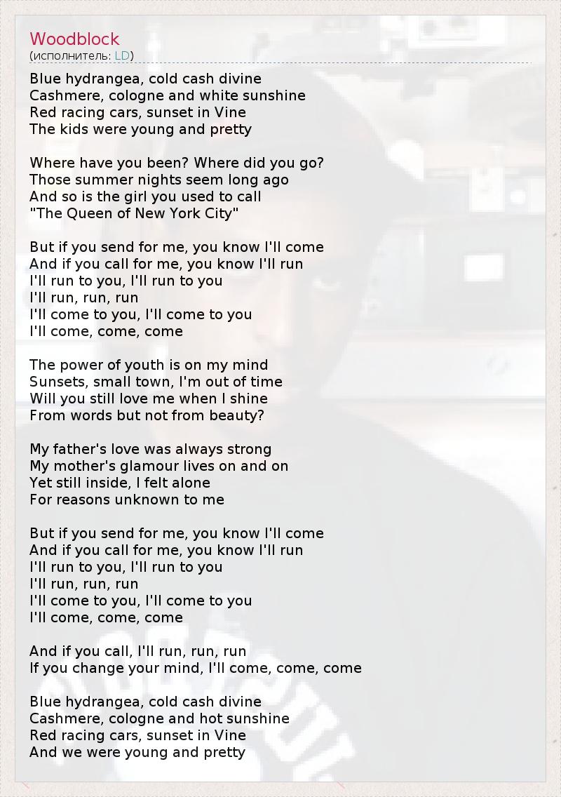 Голубая гортензия 1, превосходство в деньгах 2, Кашемир 3, одеколон и белое солнце. Красные гоночные автомобили, закат на улице Vine 4. Дети были молодыми и прелестными... Где ты пропадал? Куда ты ушёл? Те летние ночи кажутся такими давними. Как и девушка, которую ты называл "Королева Нью-Йорка"... Но если ты пошлёшь за мной, — знай, я приду. И если ты зайдёшь за мной, — знай, я побегу. Я побегу к тебе, я побегу к тебе, Я побегу, побегу, побегу. Я приду к тебе, я приду к тебе, Я приду, приду, приду. Сила молодости у меня на уме. Закаты, небольшой город, я — вне времени. Будешь ли ты всё так же любить меня, когда я буду блистать Словами, но не красотой? Любовь моего отца всегда была крепкой, Очарование моей матери не угасает. И тем не менее я чувствовала себя одиноко, По причинам, неизвестным мне... Но если ты пошлёшь за мной, — знай, я приду. И если ты зайдёшь за мной, — знай, я побегу. Я побегу к тебе, я побегу к тебе, Я побегу, побегу, побегу. Я приду к тебе, я приду к тебе, Я приду, приду, приду. И если ты позвонишь, я побегу, побегу, побегу. Если ты передумаешь, я приду, приду, приду. Голубая гортензия, превосходство в деньгах, Кашемир, одеколон и жаркое солнце. Красные гоночные автомобили, закат на улице Vine. И мы были молодыми и прелестными... * — Old money — унаследованное богатство семей из высших слоёв общества; человек или семья, обладающий этим богатством. 1 — Hydrangea — гортензия — род цветковых растений семейства Гортензиевые. Гортензии — изумительные по красоте и разнообразию кустарники, которые ценятся за разнообразие форм соцветия, обширную палитру цветов, крупные фигурные листья, неприхотливость и обильное цветение. 2 — Cold cash — наличные. 3 — Cashmere — кашемир — пух (подшёрсток) горной козы, обитающей в регионах Индии, Китая, Монголии и Пакистана. Изделия из кашемира характеризуются лёгкостью, очень приятны на ощупь. Очень дорогой и редкий материал. 4 — Vine Street — улица Vine — улица в Голливуде, Лос-Анджелес, штат Калифорния. Пересечение этой улицы с улицей Hollywood Boulevard — Hollywood and Vine — было когда-то символом Голливуда.