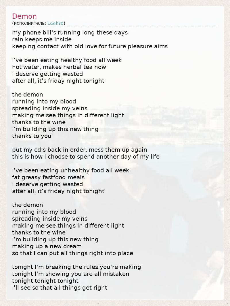 my phone bill's running long these days rain keeps me inside keeping contact with old love for future pleasure aims I've been eating healthy food all week hot water, makes herbal tea now I deserve getting wasted after all, it's friday night tonight the demon running into my blood spreading inside my veins making me see things in different light thanks to the wine I'm building up this new thing thanks to you put my cd's back in order, mess them up again this is how I choose to spend another day of my life I've been eating unhealthy food all week fat greasy fastfood meals I deserve getting wasted after all, it's friday night tonight the demon running into my blood spreading inside my veins making me see things in different light thanks to the wine I'm building up this new thing making up a new dream so that I can put all things right into place tonight I'm breaking the rules you're making tonight I'm showing you are all mistaken tonight tonight tonight I'll see so that all things get right