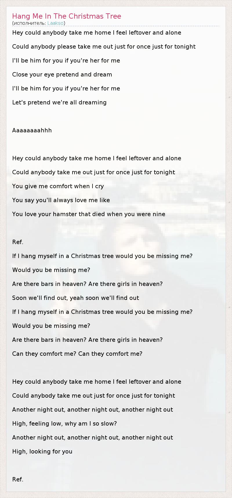 Hey could anybody take me home I feel leftover and alone Could anybody please take me out just for once just for tonight I'll be him for you if you're her for me Close your eye pretend and dream I'll be him for you if you're her for me Let's pretend we're all dreaming Aaaaaaaahhh Hey could anybody take me home I feel leftover and alone Could anybody take me out just for once just for tonight You give me comfort when I cry You say you'll always love me like You love your hamster that died when you were nine Ref. If I hang myself in a Christmas tree would you be missing me? Would you be missing me? Are there bars in heaven? Are there girls in heaven? Soon we'll find out, yeah soon we'll find out If I hang myself in a Christmas tree would you be missing me? Would you be missing me? Are there bars in heaven? Are there girls in heaven? Can they comfort me? Can they comfort me? Hey could anybody take me home I feel leftover and alone Could anybody take me out just for once just for tonight Another night out, another night out, another night out High, feeling low, why am I so slow? Another night out, another night out, another night out High, looking for you Ref.