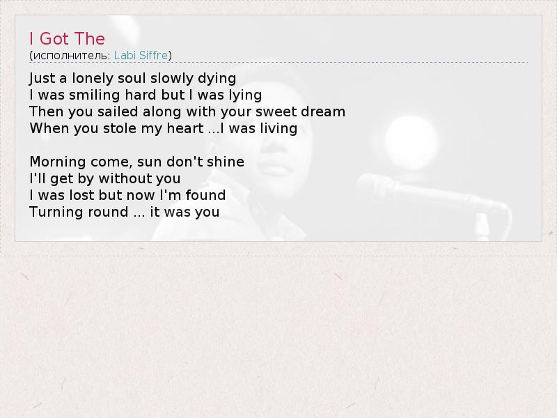Just a lonely soul slowly dying I was smiling hard but I was lying Then you sailed along with your sweet dream When you stole my heart ...I was living Morning come, sun don't shine I'll get by without you I was lost but now I'm found Turning round ... it was you