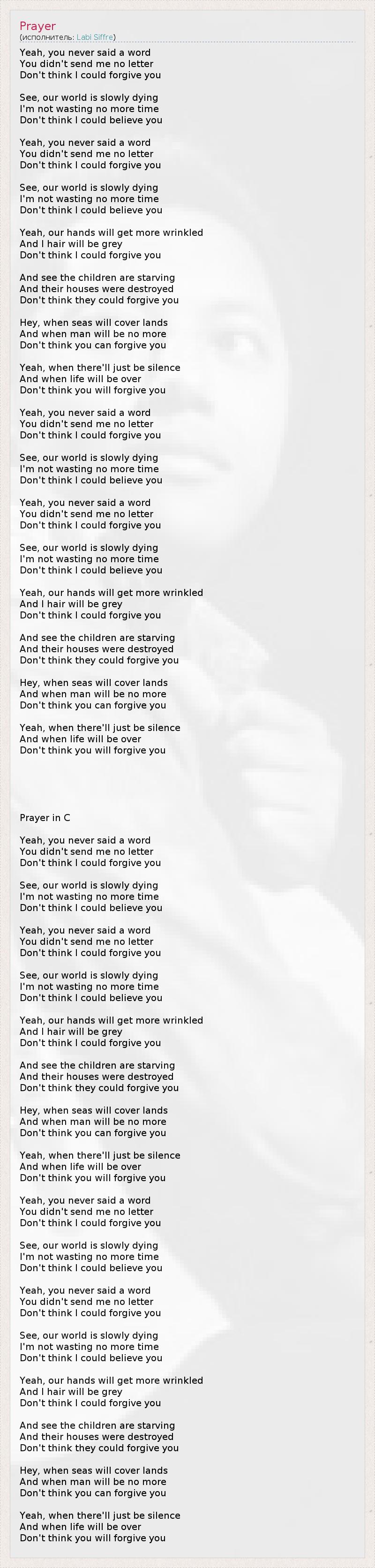 Yeah, you never said a word You didn't send me no letter Don't think I could forgive you See, our world is slowly dying I'm not wasting no more time Don't think I could believe you Yeah, you never said a word You didn't send me no letter Don't think I could forgive you See, our world is slowly dying I'm not wasting no more time Don't think I could believe you Yeah, our hands will get more wrinkled And I hair will be grey Don't think I could forgive you And see the children are starving And their houses were destroyed Don't think they could forgive you Hey, when seas will cover lands And when man will be no more Don't think you can forgive you Yeah, when there'll just be silence And when life will be over Don't think you will forgive you Yeah, you never said a word You didn't send me no letter Don't think I could forgive you See, our world is slowly dying I'm not wasting no more time Don't think I could believe you Yeah, you never said a word You didn't send me no letter Don't think I could forgive you See, our world is slowly dying I'm not wasting no more time Don't think I could believe you Yeah, our hands will get more wrinkled And I hair will be grey Don't think I could forgive you And see the children are starving And their houses were destroyed Don't think they could forgive you Hey, when seas will cover lands And when man will be no more Don't think you can forgive you Yeah, when there'll just be silence And when life will be over Don't think you will forgive you Prayer in C Yeah, you never said a word You didn't send me no letter Don't think I could forgive you See, our world is slowly dying I'm not wasting no more time Don't think I could believe you Yeah, you never said a word You didn't send me no letter Don't think I could forgive you See, our world is slowly dying I'm not wasting no more time Don't think I could believe you Yeah, our hands will get more wrinkled And I hair will be grey Don't think I could forgive you And see the children are starving And their houses were destroyed Don't think they could forgive you Hey, when seas will cover lands And when man will be no more Don't think you can forgive you Yeah, when there'll just be silence And when life will be over Don't think you will forgive you Yeah, you never said a word You didn't send me no letter Don't think I could forgive you See, our world is slowly dying I'm not wasting no more time Don't think I could believe you Yeah, you never said a word You didn't send me no letter Don't think I could forgive you See, our world is slowly dying I'm not wasting no more time Don't think I could believe you Yeah, our hands will get more wrinkled And I hair will be grey Don't think I could forgive you And see the children are starving And their houses were destroyed Don't think they could forgive you Hey, when seas will cover lands And when man will be no more Don't think you can forgive you Yeah, when there'll just be silence And when life will be over Don't think you will forgive you
