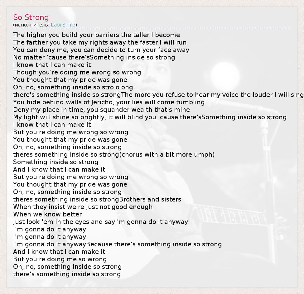 The higher you build your barriers the taller I become The farther you take my rights away the faster I will run You can deny me, you can decide to turn your face away No matter 'cause there'sSomething inside so strong I know that I can make it Though you're doing me wrong so wrong You thought that my pride was gone Oh, no, something inside so stro.o.ong there's something inside so strongThe more you refuse to hear my voice the louder I will sing You hide behind walls of Jericho, your lies will come tumbling Deny my place in time, you squander wealth that's mine My light will shine so brightly, it will blind you 'cause there'sSomething inside so strong I know that I can make it But you're doing me wrong so wrong You thought that my pride was gone Oh, no, something inside so strong theres something inside so strong(chorus with a bit more umph) Something inside so strong And I know that I can make it But you're doing me wrong so wrong You thought that my pride was gone Oh, no, something inside so strong theres something inside so strongBrothers and sisters When they insist we're just not good enough When we know better Just look 'em in the eyes and sayI'm gonna do it anyway I'm gonna do it anyway I'm gonna do it anyway I'm gonna do it anywayBecause there's something inside so strong And I know that I can make it But you're doing me so wrong Oh, no, something inside so strong there's something inside so strong
