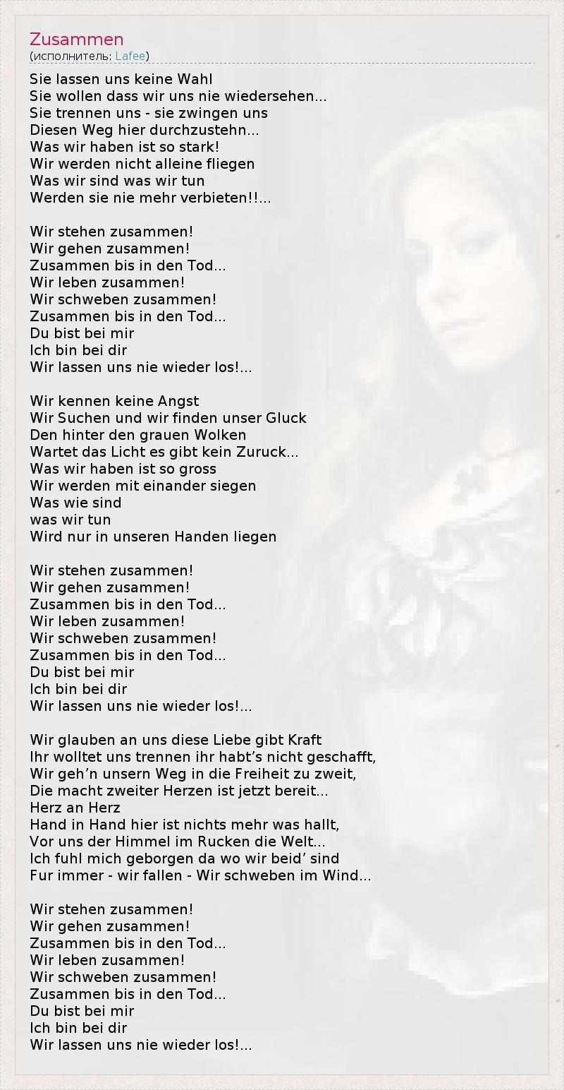Sie lassen uns keine Wahl Sie wollen dass wir uns nie wiedersehen... Sie trennen uns - sie zwingen uns Diesen Weg hier durchzustehn... Was wir haben ist so stark! Wir werden nicht alleine fliegen Was wir sind was wir tun Werden sie nie mehr verbieten!!... Wir stehen zusammen! Wir gehen zusammen! Zusammen bis in den Tod... Wir leben zusammen! Wir schweben zusammen! Zusammen bis in den Tod... Du bist bei mir Ich bin bei dir Wir lassen uns nie wieder los!... Wir kennen keine Angst Wir Suchen und wir finden unser Gluck Den hinter den grauen Wolken Wartet das Licht es gibt kein Zuruck... Was wir haben ist so gross Wir werden mit einander siegen Was wie sind was wir tun Wird nur in unseren Handen liegen Wir stehen zusammen! Wir gehen zusammen! Zusammen bis in den Tod... Wir leben zusammen! Wir schweben zusammen! Zusammen bis in den Tod... Du bist bei mir Ich bin bei dir Wir lassen uns nie wieder los!... Wir glauben an uns diese Liebe gibt Kraft Ihr wolltet uns trennen ihr habt’s nicht geschafft, Wir geh’n unsern Weg in die Freiheit zu zweit, Die macht zweiter Herzen ist jetzt bereit... Herz an Herz Hand in Hand hier ist nichts mehr was hallt, Vor uns der Himmel im Rucken die Welt... Ich fuhl mich geborgen da wo wir beid’ sind Fur immer - wir fallen - Wir schweben im Wind... Wir stehen zusammen! Wir gehen zusammen! Zusammen bis in den Tod... Wir leben zusammen! Wir schweben zusammen! Zusammen bis in den Tod... Du bist bei mir Ich bin bei dir Wir lassen uns nie wieder los!...