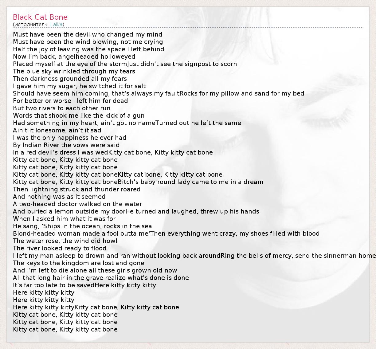 Must have been the devil who changed my mind Must have been the wind blowing, not me crying Half the joy of leaving was the space I left behind Now I'm back, angelheaded holloweyed Placed myself at the eye of the stormJust didn't see the signpost to scorn The blue sky wrinkled through my tears Then darkness grounded all my fears I gave him my sugar, he switched it for salt Should have seem him coming, that's always my faultRocks for my pillow and sand for my bed For better or worse I left him for dead But two rivers to each other run Words that shook me like the kick of a gun Had something in my heart, ain't got no nameTurned out he left the same Ain't it lonesome, ain't it sad I was the only happiness he ever had By Indian River the vows were said In a red devil's dress I was wedKitty cat bone, Kitty kitty cat bone Kitty cat bone, Kitty kitty cat bone Kitty cat bone, Kitty kitty cat bone Kitty cat bone, Kitty kitty cat boneKitty cat bone, Kitty kitty cat bone Kitty cat bone, Kitty kitty cat boneBitch's baby round lady came to me in a dream Then lightning struck and thunder roared And nothing was as it seemed A two-headed doctor walked on the water And buried a lemon outside my doorHe turned and laughed, threw up his hands When I asked him what it was for He sang, 'Ships in the ocean, rocks in the sea Blond-headed woman made a fool outta me'Then everything went crazy, my shoes filled with blood The water rose, the wind did howl The river looked ready to flood I left my man asleep to drown and ran without looking back aroundRing the bells of mercy, send the sinnerman home The keys to the kingdom are lost and gone And I'm left to die alone all these girls grown old now All that long hair in the grave realize what's done is done It's far too late to be savedHere kitty kitty kitty Here kitty kitty kitty Here kitty kitty kitty Here kitty kitty kittyKitty cat bone, Kitty kitty cat bone Kitty cat bone, Kitty kitty cat bone Kitty cat bone, Kitty kitty cat bone Kitty cat bone, Kitty kitty cat bone