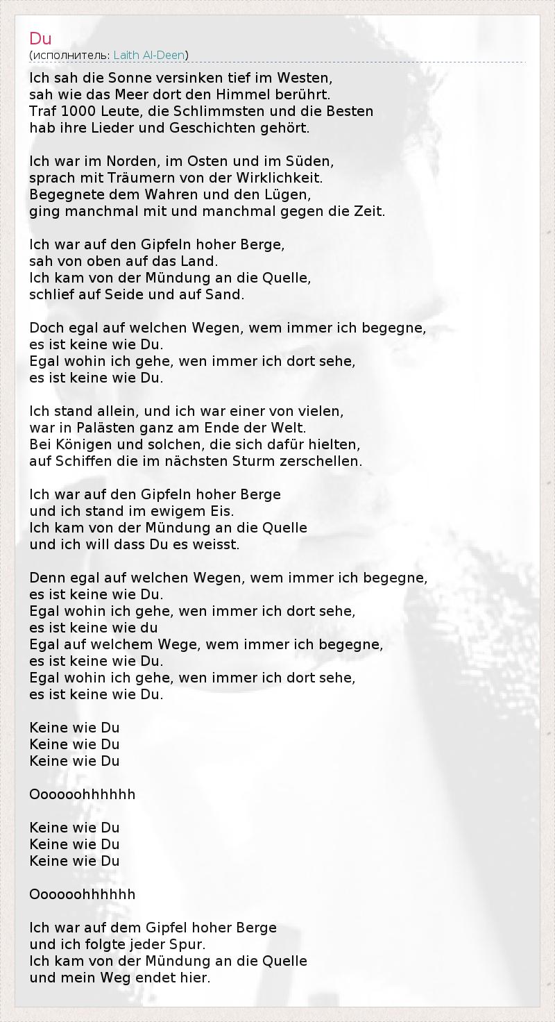 Ich sah die Sonne versinken tief im Westen, sah wie das Meer dort den Himmel berührt. Traf 1000 Leute, die Schlimmsten und die Besten hab ihre Lieder und Geschichten gehört. Ich war im Norden, im Osten und im Süden, sprach mit Träumern von der Wirklichkeit. Begegnete dem Wahren und den Lügen, ging manchmal mit und manchmal gegen die Zeit. Ich war auf den Gipfeln hoher Berge, sah von oben auf das Land. Ich kam von der Mündung an die Quelle, schlief auf Seide und auf Sand. Doch egal auf welchen Wegen, wem immer ich begegne, es ist keine wie Du. Egal wohin ich gehe, wen immer ich dort sehe, es ist keine wie Du. Ich stand allein, und ich war einer von vielen, war in Palästen ganz am Ende der Welt. Bei Königen und solchen, die sich dafür hielten, auf Schiffen die im nächsten Sturm zerschellen. Ich war auf den Gipfeln hoher Berge und ich stand im ewigem Eis. Ich kam von der Mündung an die Quelle und ich will dass Du es weisst. Denn egal auf welchen Wegen, wem immer ich begegne, es ist keine wie Du. Egal wohin ich gehe, wen immer ich dort sehe, es ist keine wie du Egal auf welchem Wege, wem immer ich begegne, es ist keine wie Du. Egal wohin ich gehe, wen immer ich dort sehe, es ist keine wie Du. Keine wie Du Keine wie Du Keine wie Du Oooooohhhhhh Keine wie Du Keine wie Du Keine wie Du Oooooohhhhhh Ich war auf dem Gipfel hoher Berge und ich folgte jeder Spur. Ich kam von der Mündung an die Quelle und mein Weg endet hier.