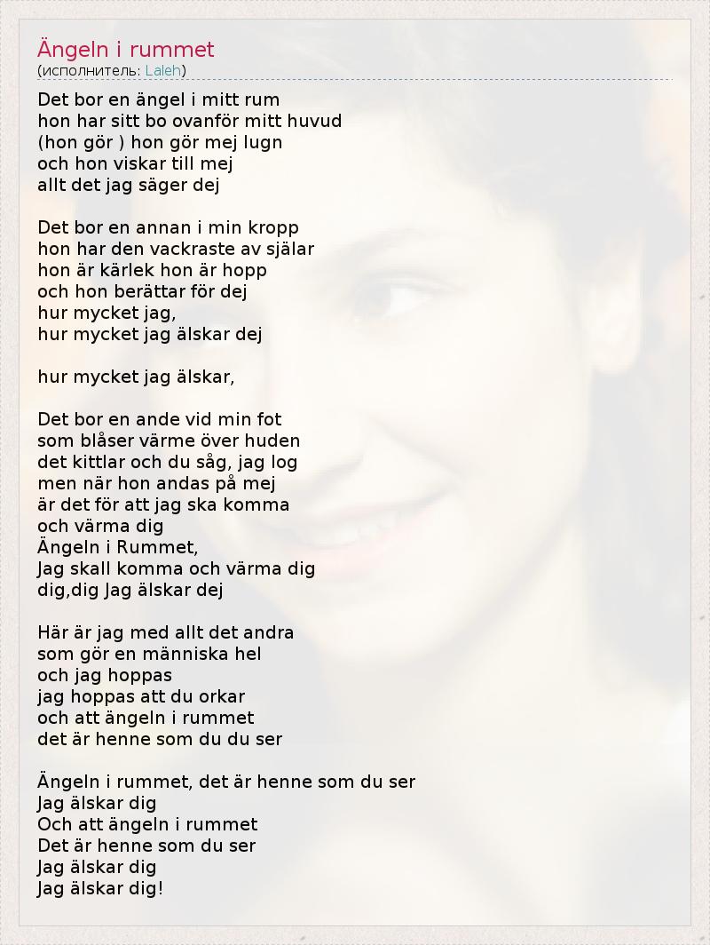 Det bor en ängel i mitt rum hon har sitt bo ovanför mitt huvud (hon gör ) hon gör mej lugn och hon viskar till mej allt det jag säger dej Det bor en annan i min kropp hon har den vackraste av själar hon är kärlek hon är hopp och hon berättar för dej hur mycket jag, hur mycket jag älskar dej hur mycket jag älskar, Det bor en ande vid min fot som blåser värme över huden det kittlar och du såg, jag log men när hon andas på mej är det för att jag ska komma och värma dig Ängeln i Rummet, Jag skall komma och värma dig dig,dig Jag älskar dej Här är jag med allt det andra som gör en människa hel och jag hoppas jag hoppas att du orkar och att ängeln i rummet det är henne som du du ser Ängeln i rummet, det är henne som du ser Jag älskar dig Och att ängeln i rummet Det är henne som du ser Jag älskar dig Jag älskar dig!