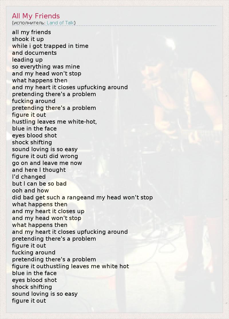 all my friends shook it up while i got trapped in time and documents leading up so everything was mine and my head won't stop what happens then and my heart it closes upfucking around pretending there's a problem fucking around pretending there's a problem figure it out hustling leaves me white-hot, blue in the face eyes blood shot shock shifting sound loving is so easy figure it outi did wrong go on and leave me now and here I thought I'd changed but I can be so bad ooh and how did bad get such a rangeand my head won't stop what happens then and my heart it closes up and my head won't stop what happens then and my heart it closes upfucking around pretending there's a problem figure it out fucking around pretending there's a problem figure it outhustling leaves me white hot blue in the face eyes blood shot shock shifting sound loving is so easy figure it out