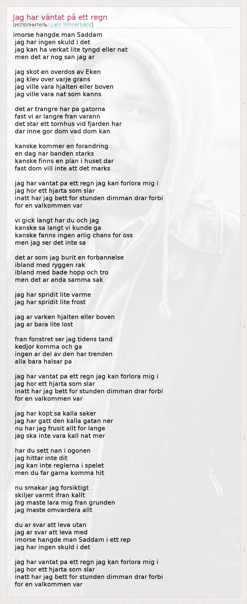 imorse hangde man Saddam jag har ingen skuld i det jag kan ha verkat lite tyngd eller nat men det ar nog san jag ar jag skot en overdos av Eken jag klev over varje grans jag ville vara hjalten eller boven jag ville vara nat som kanns det ar trangre har pa gatorna fast vi ar langre fran varann det star ett tornhus vid fjarden har dar inne gor dom vad dom kan kanske kommer en forandring en dag nar banden starks kanske finns en plan i huset dar fast dom vill inte att det marks jag har vantat pa ett regn jag kan forlora mig i jag hor ett hjarta som slar inatt har jag bett for stunden dimman drar forbi for en valkommen var vi gick langt har du och jag kanske sa langt vi kunde ga kanske fanns ingen arlig chans for oss men jag ser det inte sa det ar som jag burit en forbannelse ibland med ryggen rak ibland med bade hopp och tro men det ar anda samma sak jag har spridit lite varme jag har spridit lite frost jag ar varken hjalten eller boven jag ar bara lite lost fran fonstret ser jag tidens tand kedjor komma och ga ingen ar del av den har trenden alla bara halsar pa jag har vantat pa ett regn jag kan forlora mig i jag hor ett hjarta som slar inatt har jag bett for stunden dimman drar forbi for en valkommen var jag har kopt sa kalla saker jag har gatt den kalla gatan ner nu har jag frusit allt for lange jag ska inte vara kall nat mer har du sett nan i ogonen jag hittar inte dit jag kan inte reglerna i spelet men du far garna komma hit nu smakar jag forsiktigt skiljer varmt ifran kallt jag maste lara mig fran grunden jag maste omvardera allt du ar svar att leva utan jag ar svar att leva med imorse hangde man Saddam i ett rep jag har ingen skuld i det jag har vantat pa ett regn jag kan forlora mig i jag hor ett hjarta som slar inatt har jag bett for stunden dimman drar forbi for en valkommen var