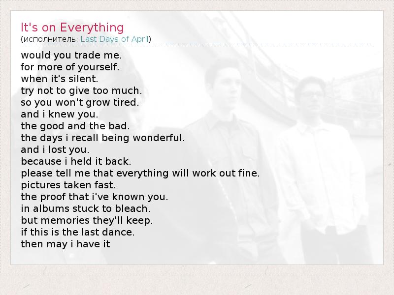 Это интересно:Группа была основана в 1996 году в Стокгольме. Дебютный одноименный альбом шведской группы "Last Days Of April" вышел в 1997 году, и если сравнить его с последней работой - “Might As Well Live" - можно подумать, что это 2 совершенно разные группы, мало похожие друг на друга. Сама же группа утверждает, что это именно то звучание, к которому они шли 8 лет.В 1998 году группа подписала контракт с Bad Taste Records... продолжение