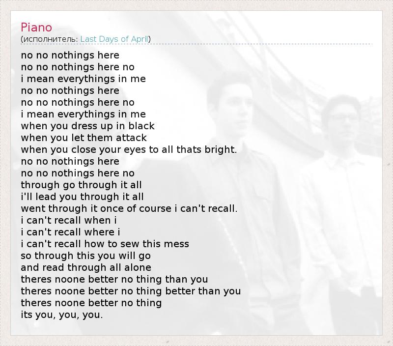 no no nothings here no no nothings here no i mean everythings in me no no nothings here no no nothings here no i mean everythings in me when you dress up in black when you let them attack when you close your eyes to all thats bright. no no nothings here no no nothings here no through go through it all i'll lead you through it all went through it once of course i can't recall. i can't recall when i i can't recall where i i can't recall how to sew this mess so through this you will go and read through all alone theres noone better no thing than you theres noone better no thing better than you theres noone better no thing its you, you, you.
