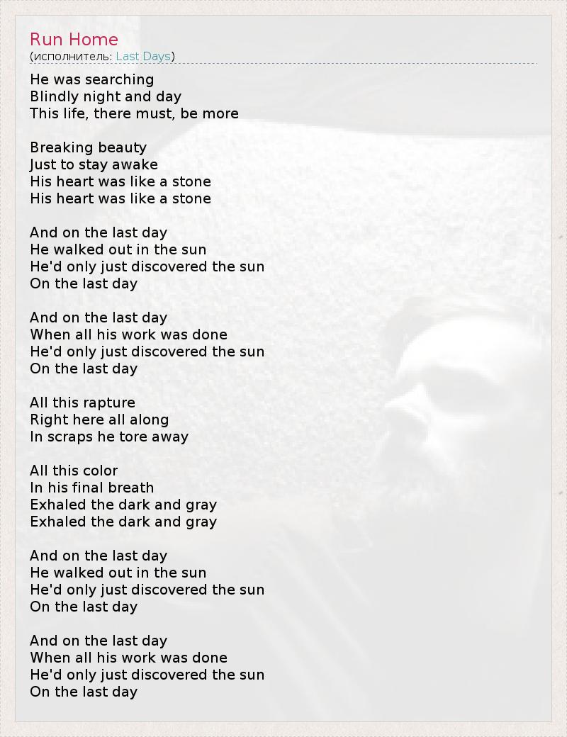 Он искал Слепо днем и ночью Эту жизнь, а может нечто большее. Уничтожая прекрасное, Просто чтобы не заснуть, Его сердце походило на камень, Его сердце походило на камень И в последний день Он вышел на солнце, Он только что открыл для себя солнце, В последний день... И в последний день, Когда он думал, что все завершил, Он только что открыл для себя солнце, В последний день... Все это восхищение, Что он сейчас испытал, В клочки разорвал Все эти краски Вдохнув последний раз, Он выдохнул темнотой и серостью, Он выдохнул темнотой и серостью И в последний день Он вышел на солнце, Он только что открыл для себя солнце, В последний день... И в последний день, Когда он думал, что все завершил, Он только что открыл для себя солнце, В последний день...