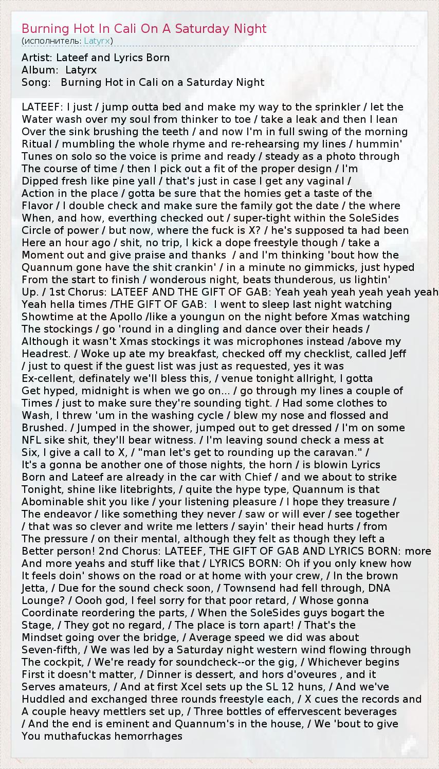 ГлавнаяИсполнителиLatyrxBurning Hot In Cali On A Saturday Night