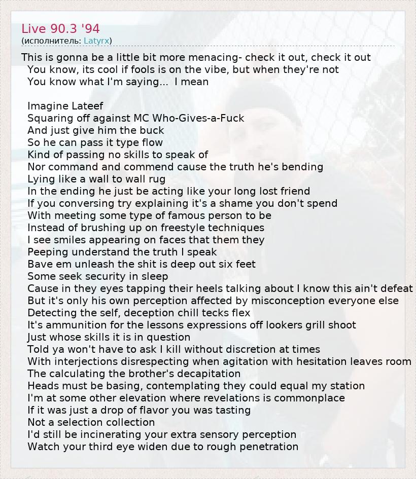 This is gonna be a little bit more menacing- check it out, check it out You know, its cool if fools is on the vibe, but when they're not You know what I'm saying... I mean Imagine Lateef Squaring off against MC Who-Gives-a-Fuck And just give him the buck So he can pass it type flow Kind of passing no skills to speak of Nor command and commend cause the truth he's bending Lying like a wall to wall rug In the ending he just be acting like your long lost friend If you conversing try explaining it's a shame you don't spend With meeting some type of famous person to be Instead of brushing up on freestyle techniques I see smiles appearing on faces that them they Peeping understand the truth I speak Bave em unleash the shit is deep out six feet Some seek security in sleep Cause in they eyes tapping their heels talking about I know this ain't defeat But it's only his own perception affected by misconception everyone else Detecting the self, deception chill tecks flex It's ammunition for the lessons expressions off lookers grill shoot Just whose skills it is in question Told ya won't have to ask I kill without discretion at times With interjections disrespecting when agitation with hesitation leaves room The calculating the brother's decapitation Heads must be basing, contemplating they could equal my station I'm at some other elevation where revelations is commonplace If it was just a drop of flavor you was tasting Not a selection collection I'd still be incinerating your extra sensory perception Watch your third eye widen due to rough penetration