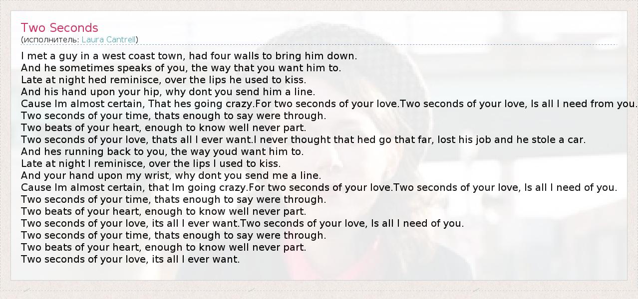 I met a guy in a west coast town, had four walls to bring him down. And he sometimes speaks of you, the way that you want him to. Late at night hed reminisce, over the lips he used to kiss. And his hand upon your hip, why dont you send him a line. Cause Im almost certain, That hes going crazy.For two seconds of your love.Two seconds of your love, Is all I need from you. Two seconds of your time, thats enough to say were through. Two beats of your heart, enough to know well never part. Two seconds of your love, thats all I ever want.I never thought that hed go that far, lost his job and he stole a car. And hes running back to you, the way youd want him to. Late at night I reminisce, over the lips I used to kiss. And your hand upon my wrist, why dont you send me a line. Cause Im almost certain, that Im going crazy.For two seconds of your love.Two seconds of your love, Is all I need of you. Two seconds of your time, thats enough to say were through. Two beats of your heart, enough to know well never part. Two seconds of your love, its all I ever want.Two seconds of your love, Is all I need of you. Two seconds of your time, thats enough to say were through. Two beats of your heart, enough to know well never part. Two seconds of your love, its all I ever want.